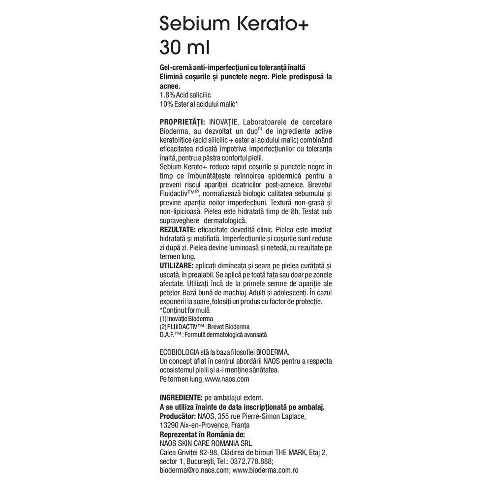Ultima actualizare a informatiilor de prezentare pentru Gel crema anti-imperfectiuni Sebium Kerato+, 30 ml, Bioderma a fost efectuata la data de 17-04-2026.  |  Raporteaza Descriere Gresita
