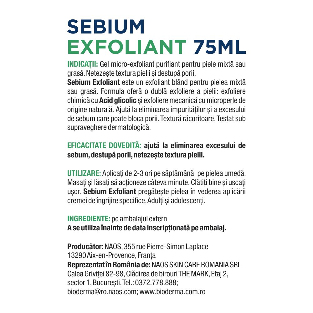 Sebium Exfoliant este un exfoliant facial bland, special formulat pentru pielea mixta sau grasa, inclusiv pielea cu tendinta acneica. Formula sa combina exfolierea chimica cu acid glicolic si exfolierea mecanica cu microperle de origine naturala, ajutand la curatarea porilor, eliminarea impuritatilor si reducerea excesului de sebum. Textura racoritoare lasa pielea neteda, curata si pregatita pentru aplicarea produselor de ingrijire ulterioare.