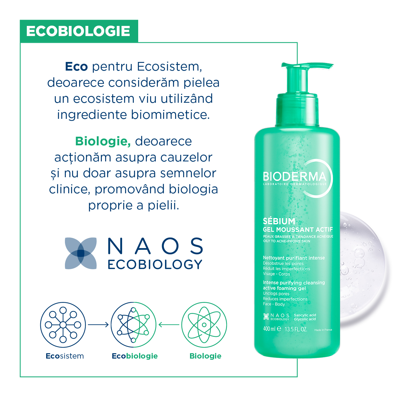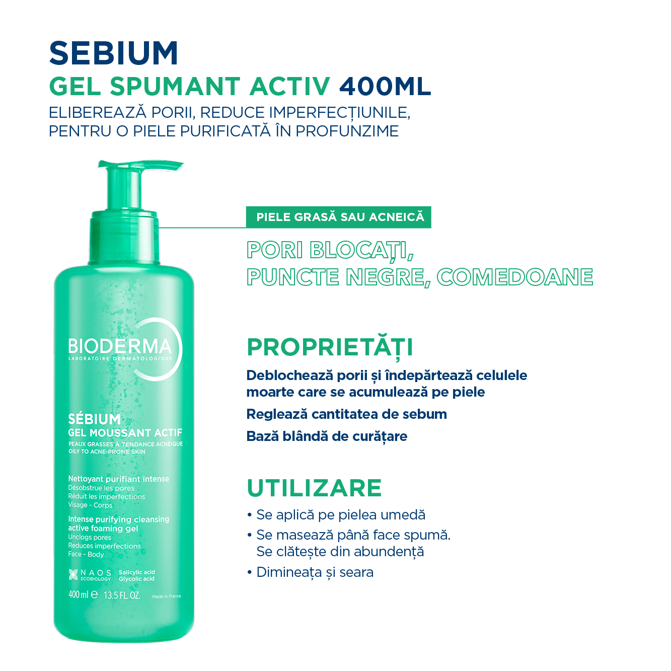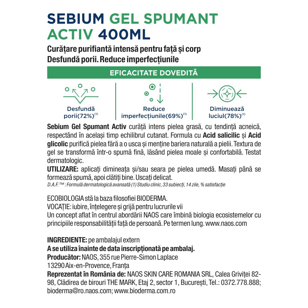Ultima actualizare a informatiilor de prezentare pentru Gel spumant Activ Sebium, 400 ml, Bioderma a fost efectuata la data de 27-04-2026.  |  Raporteaza Descriere Gresita