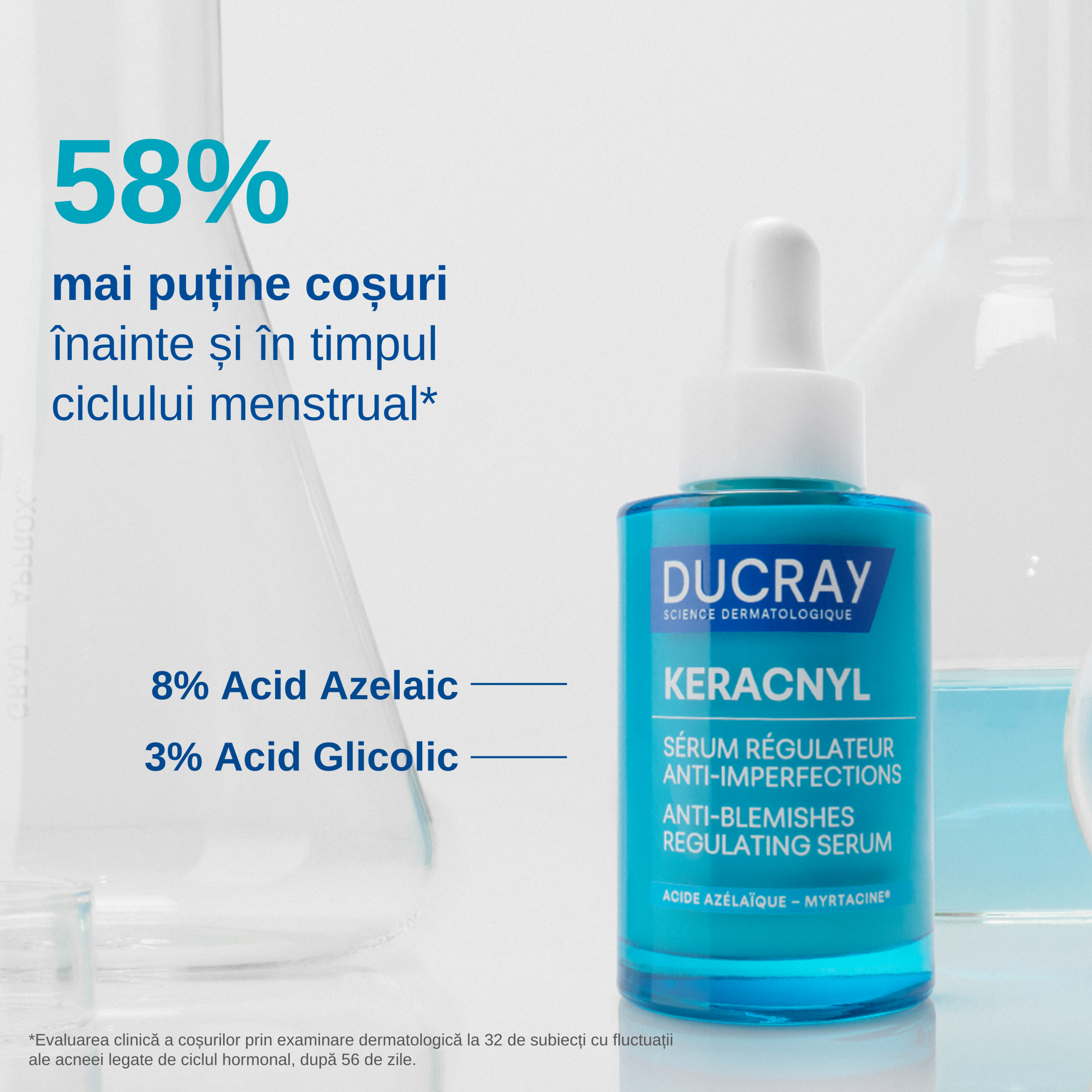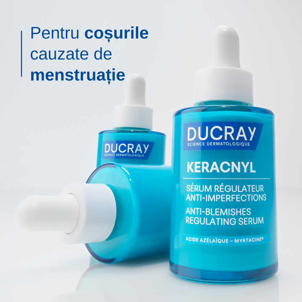 KERACNYL Ser Echilibrant Anti-imperfectiuni este un ser facial dedicat tenului acneic si predispus la imperfectiuni, formulat special pentru a raspunde dezechilibrelor cauzate de ciclurile hormonale, alimentatie sau stres. Datorita sinergiei calmante brevetate Myrtacine® si Celastrol®, serul actioneaza direct asupra mecanismelor implicate in aparitia cosurilor, contribuind la limitarea proliferarii bacteriene si la prevenirea evolutiei acestora in leziuni inflamatorii. Textura usoara se absoarbe rapid si ajuta la mentinerea unui ten mai curat, mai echilibrat si mai uniform.