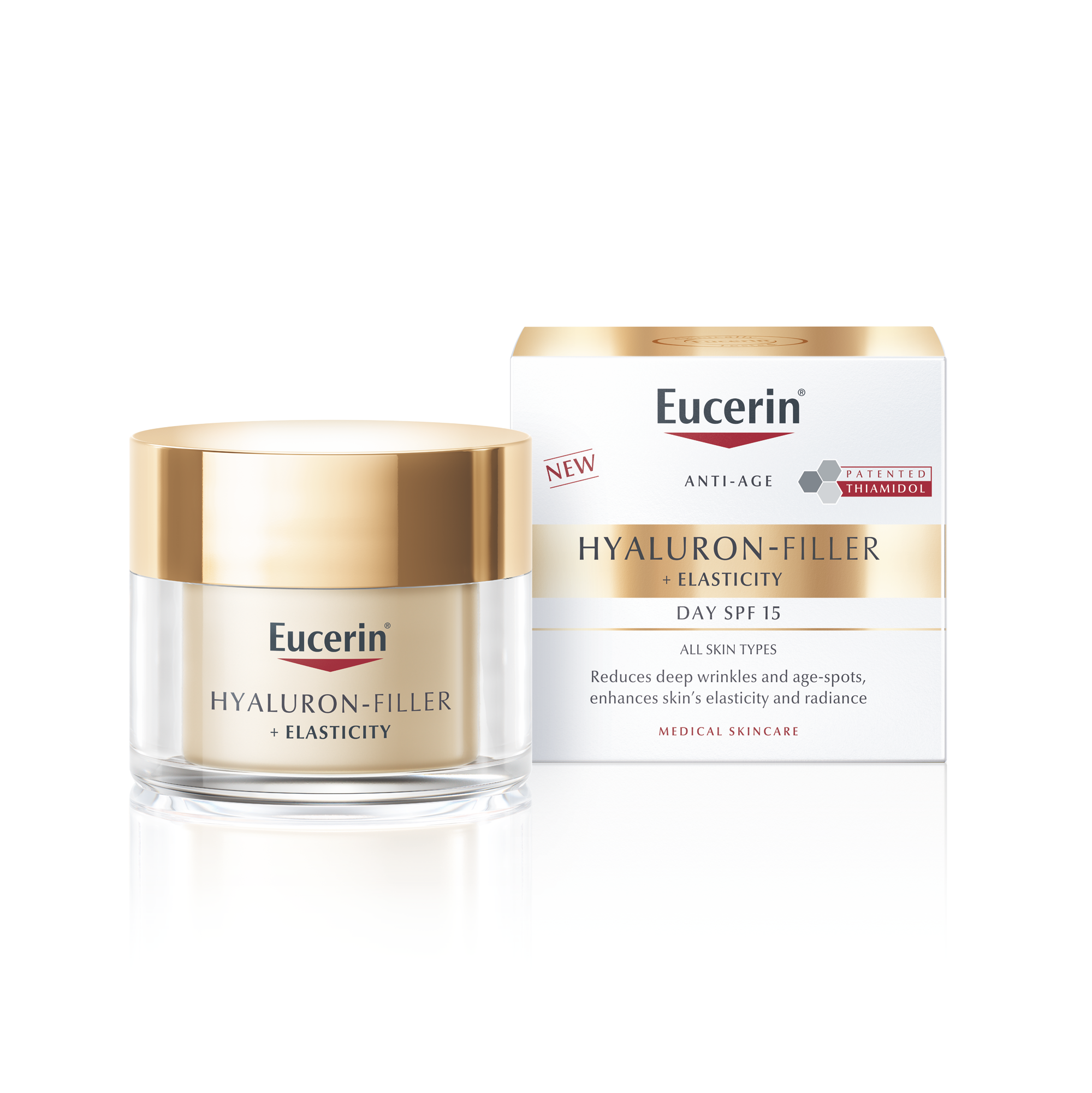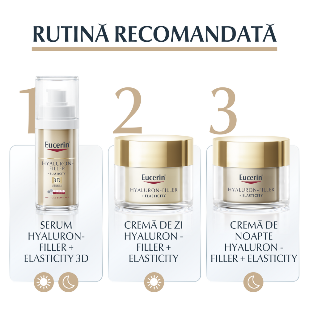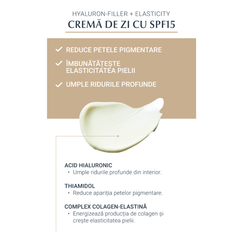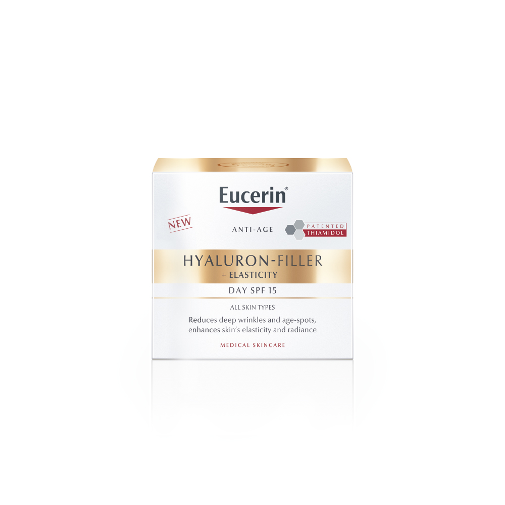 Eucerin Hyaluron-Filler + Elasticity SPF15 este o cremă de zi antirid destinată tenului matur, care acționează eficient împotriva semnelor vizibile ale îmbătrânirii pielii. Formula inovatoare combină ingrediente active de înaltă performanță pentru a stimula producția de colagen, a crește elasticitatea și a reduce ridurile adânci, redând pielii fermitate și un aspect vizibil întinerit. În plus, conține Thiamidol®, un ingredient patentat care reduce petele pigmentare, și acid hialuronic cu greutate moleculară mică și mare pentru hidratare intensă.
