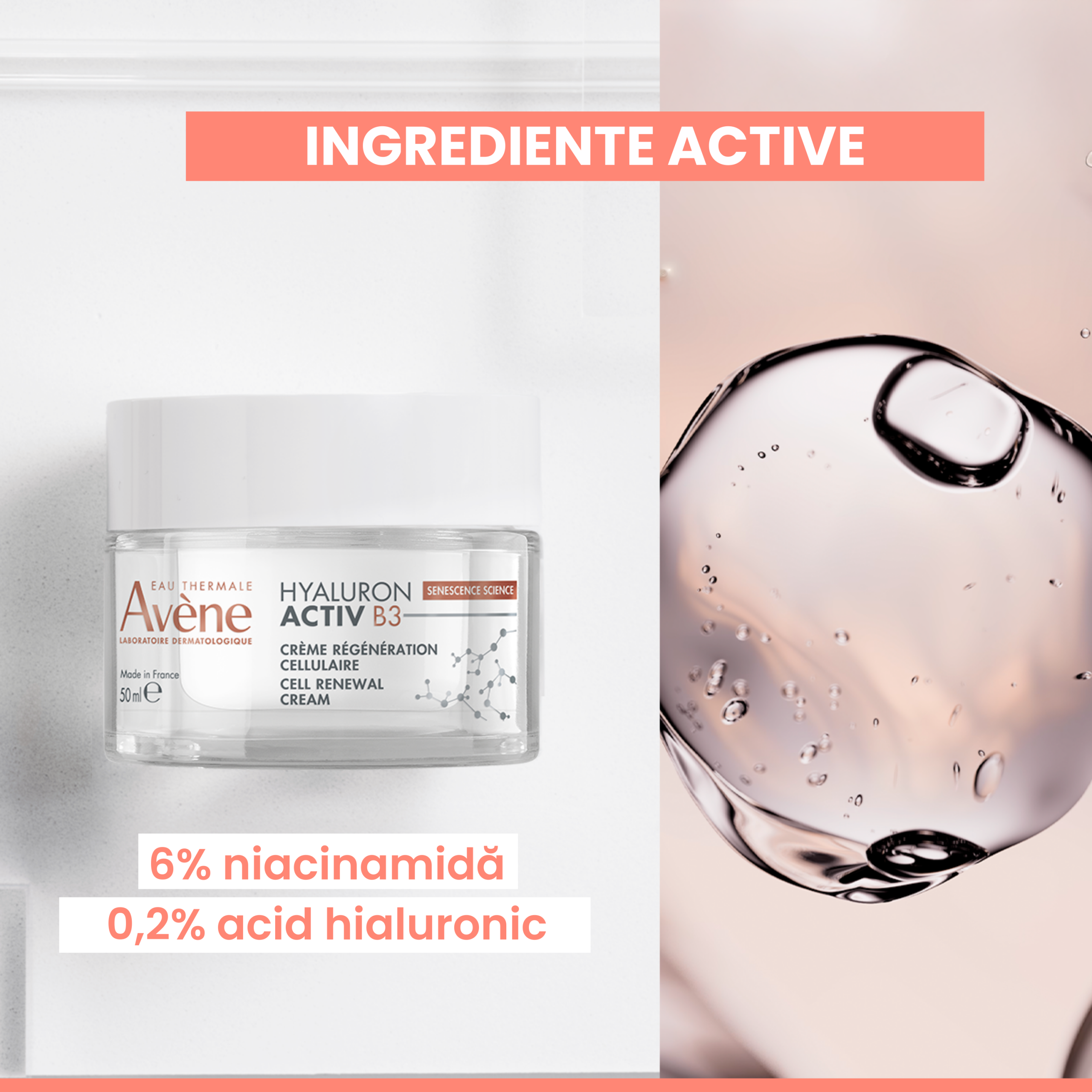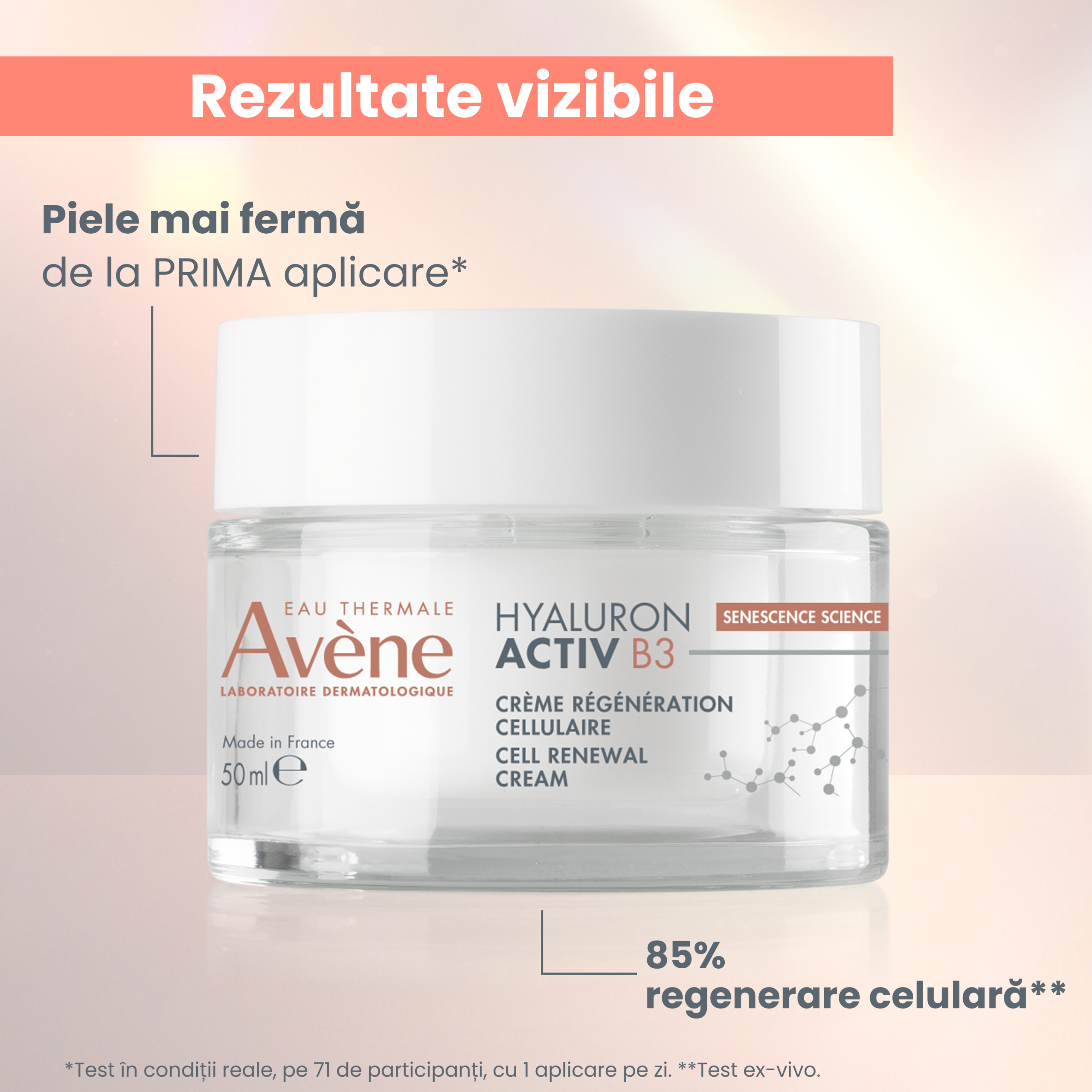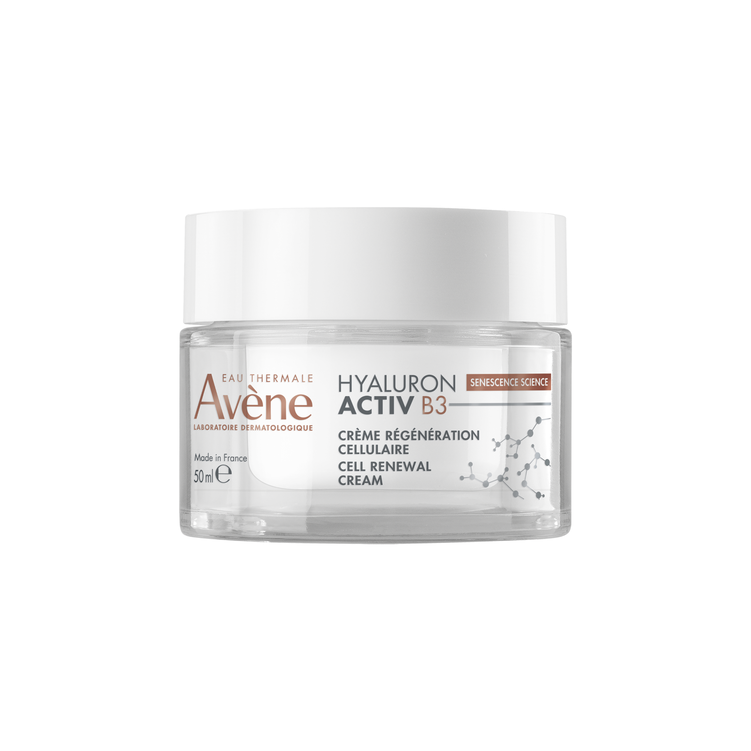 Odată cu vârsta, totul este pe repede înainte. Celulele îmbătrânite se răspândesc iar pielea nu mai are același tonus. Laboratoarele Dermatologice Avène creează Hyaluron Activ B3 Cremă pentru regenerare celulară cu 0,2% acid hialuronic pur (greutate moleculară mare și mică) și 6% niacinamidă pentru a acționa asupra cauzei îmbătrânirii și a prelungi viața celulelor2. De la prima aplicare, pielea este mai plină și iluminată. După 15 zile, pielea este regenerată, mai fermă și ridurile sunt corectate3.