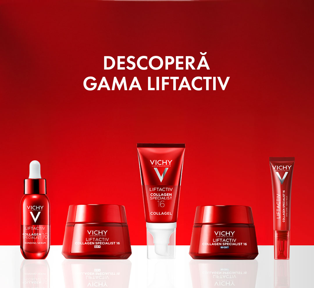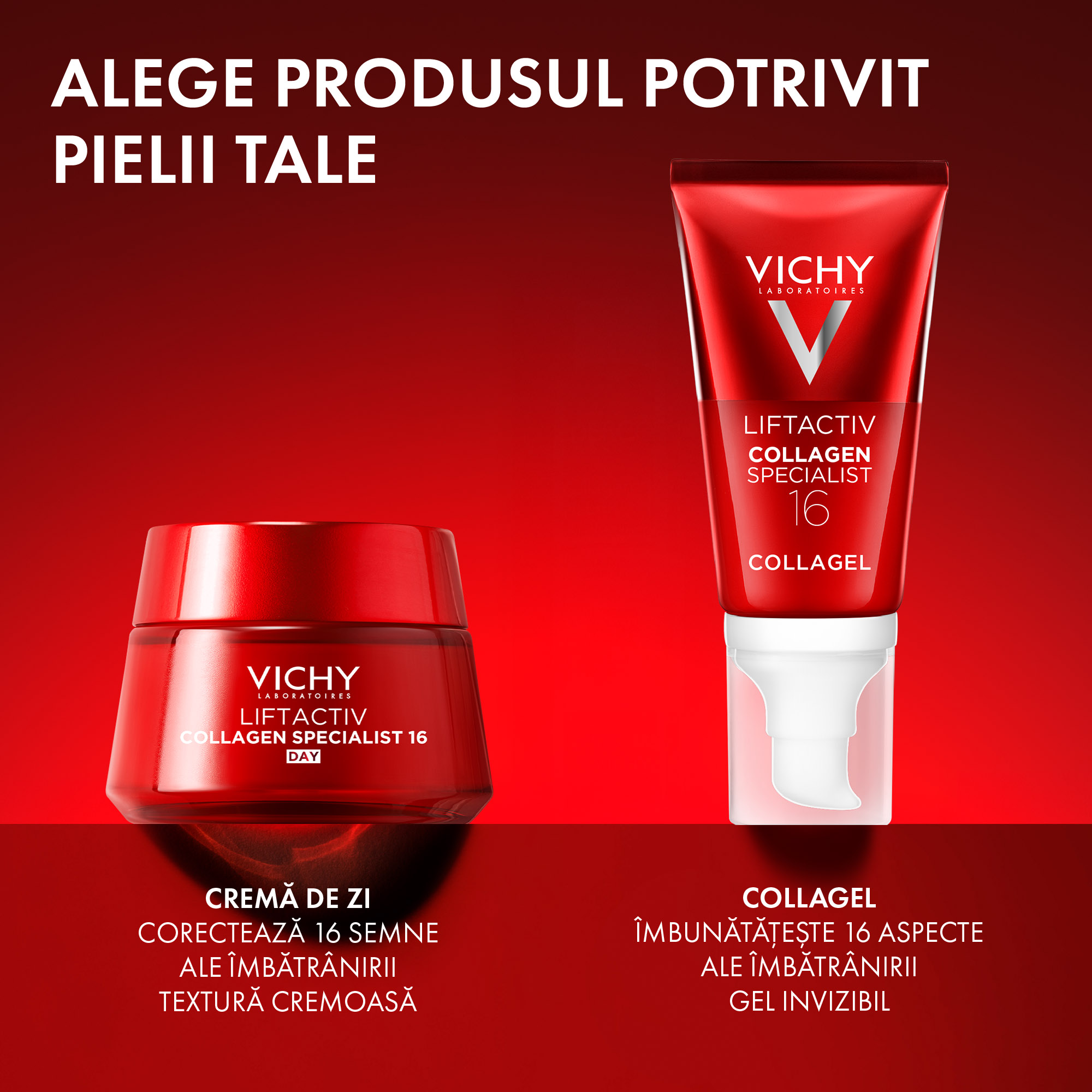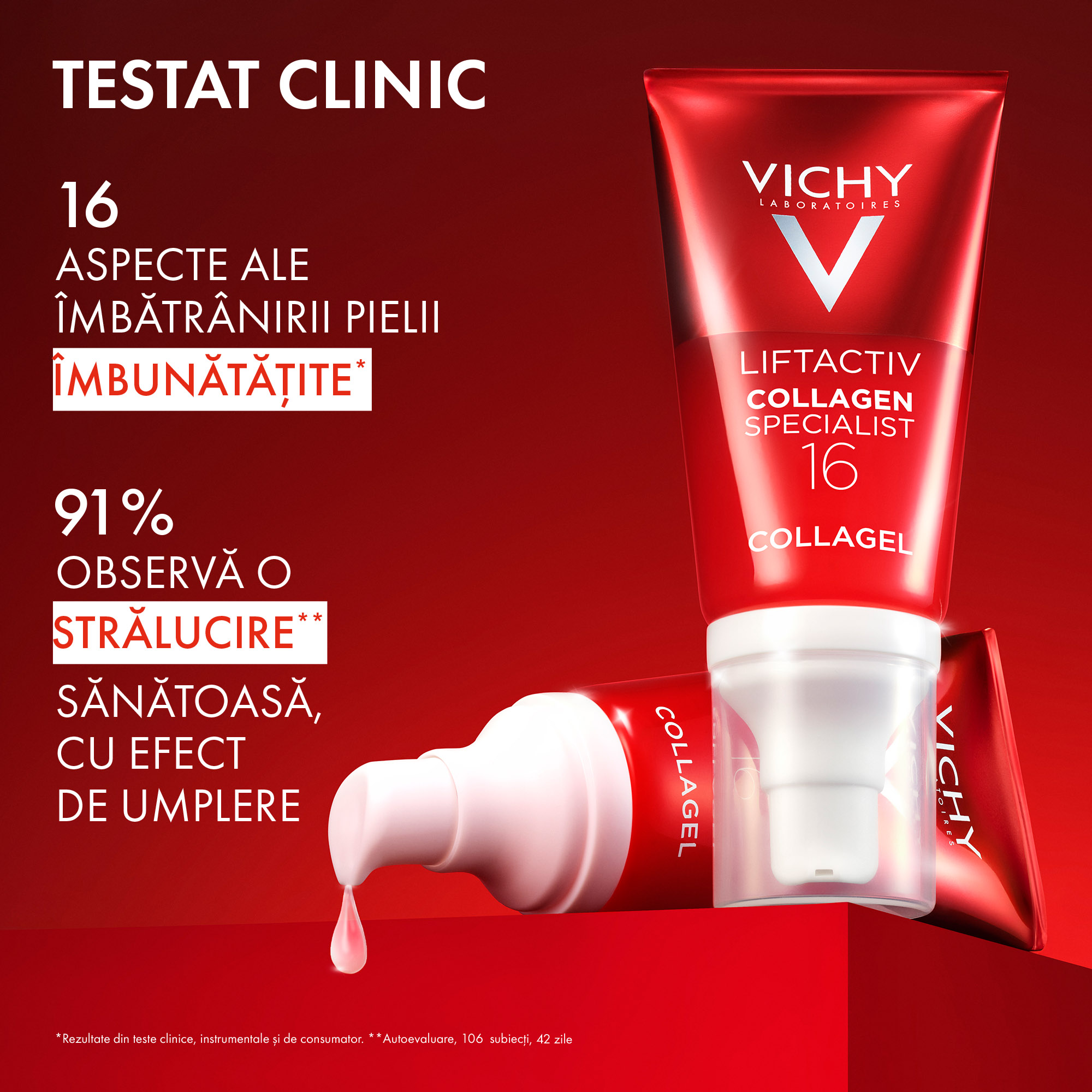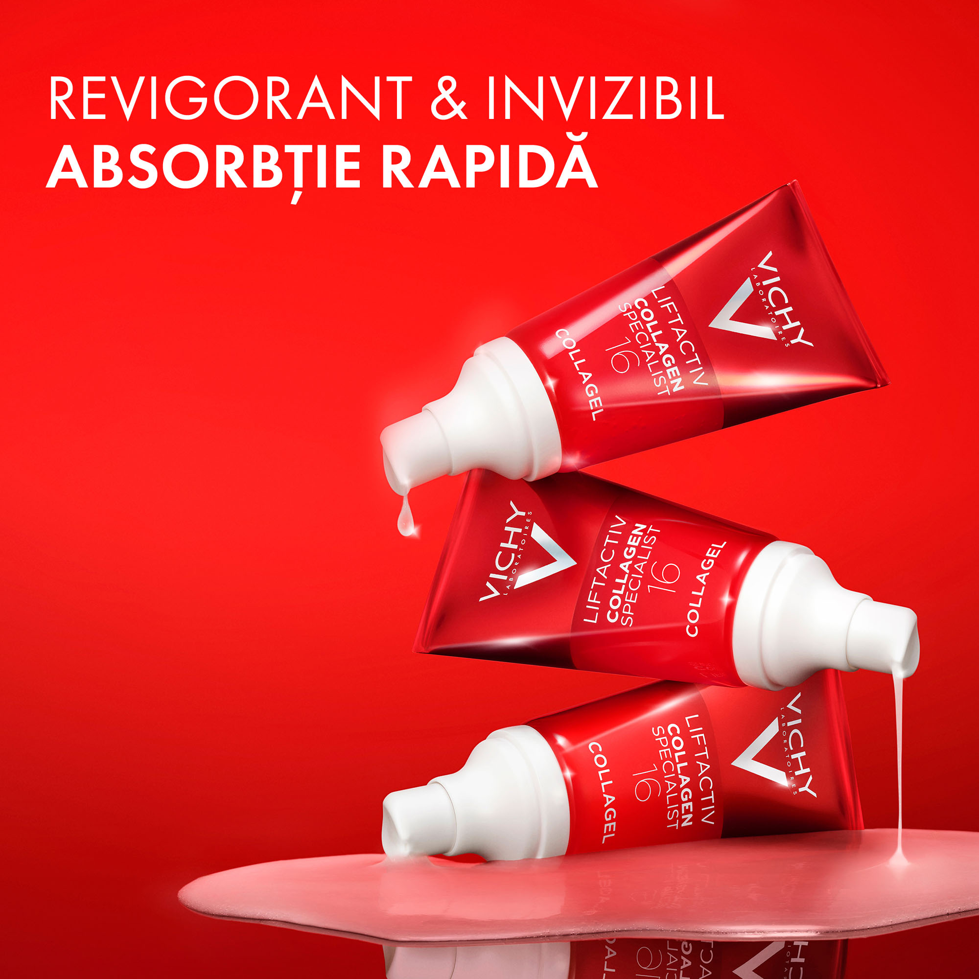 Liftactiv Collagen Specialist 16 Collagel este un gel matifiant pentru iluminarea si hidratarea tenului, creat pentru a actiona global asupra semnelor imbatranirii pielii. Formula sa avansata tine cont de faptul ca in piele exista 16 tipuri de colagen, interconectate intr-o matrice complexa, a caror productie incepe sa scada inca de la varsta de 25 de ani. Datorita tehnologiei inovatoare CO-BONDING [Ramnoza + Peptide + Maitake], gelul ajuta la imbunatatirea vizibila a aspectului pielii, oferind hidratare de pana la 24 de ore si un ten mai luminos, neted si revitalizat.