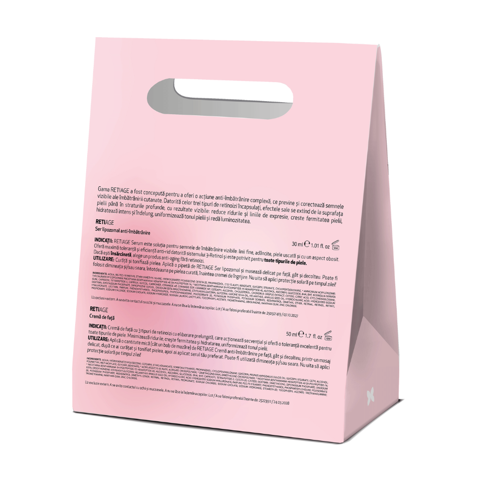 Pachet RETI AGE Crema de fata + Ser anti-imbatranire este o combinatie premium destinata tenului matur, ce ofera o actiune anti-aging completa. Formulele avansate cu sistem 3-Retinol lipozomal reduc ridurile, uniformizeaza textura pielii si stimuleaza regenerarea celulara, pentru un aspect vizibil intinerit si luminos. Ideal pentru rutina zilnica de ingrijire, acest duo redensifica pielea, creste fermitatea si confera hidratare de lunga durata.