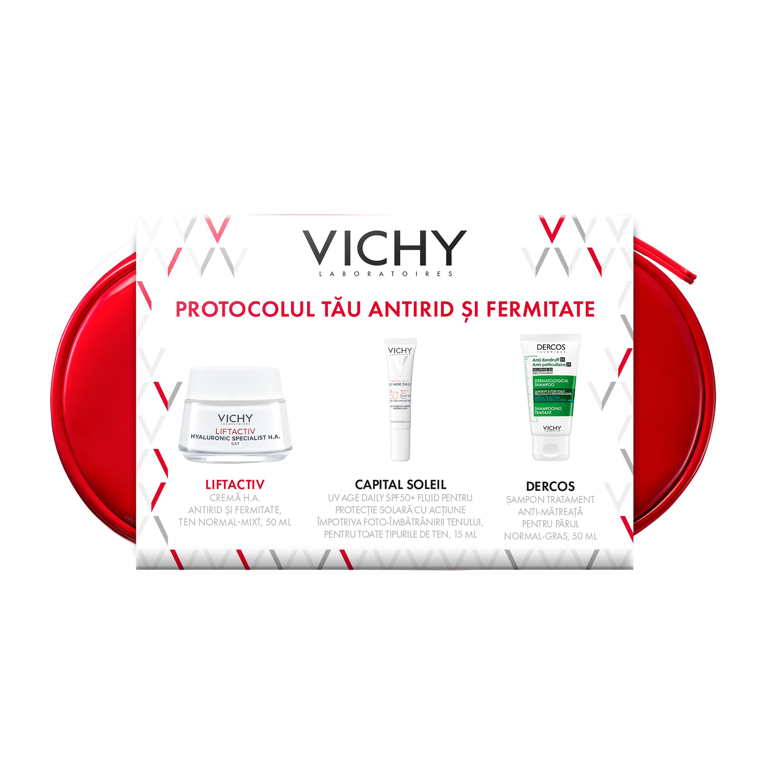 Oferiti cadou un set complet Vichy pentru ingrijire zilnica, conceput pentru ten normal si mixt: Trusa Liftactiv Hyaluronic Specialist H.A. include o crema antirid de zi, un sampon tratament anti-matreata si un fluid cu protectie solara ridicata, ideal pentru o rutina echilibrata.