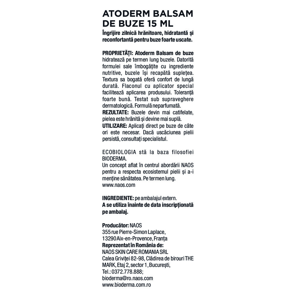 Ultima actualizare a informatiilor de prezentare pentru Balsam de buze Atoderm, 15 ml, Bioderma a fost efectuata la data de 23-04-2026.  |  Raporteaza Descriere Gresita