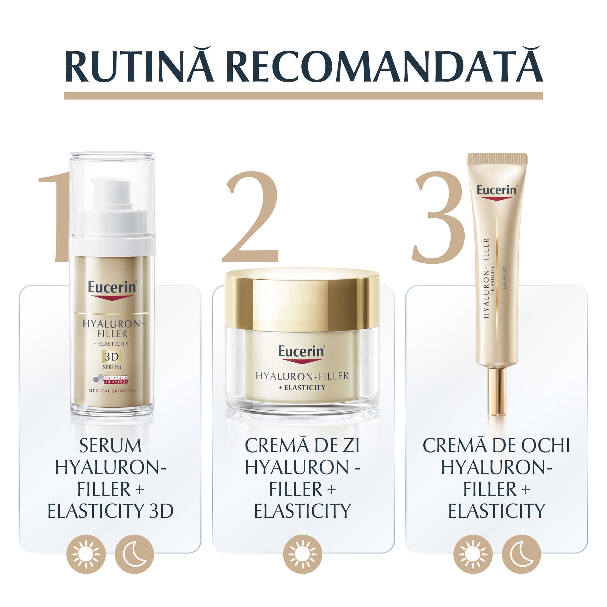 Eucerin Hyaluron-Filler + Elasticity SPF 20 este o cremă de ochi antirid, special formulată pentru pielea matură, care combate eficient semnele îmbătrânirii în zona delicată din jurul ochilor. Datorită combinației avansate de Acid Hialuronic cu greutate moleculară mare și mică și Arctiină, crema umple chiar și ridurile profunde, îmbunătățește elasticitatea pielii și reduce aspectul cearcănelor. În plus, factorul de protecție solară SPF 20 cu filtru UVA protejează pielea de razele UV care accelerează îmbătrânirea.