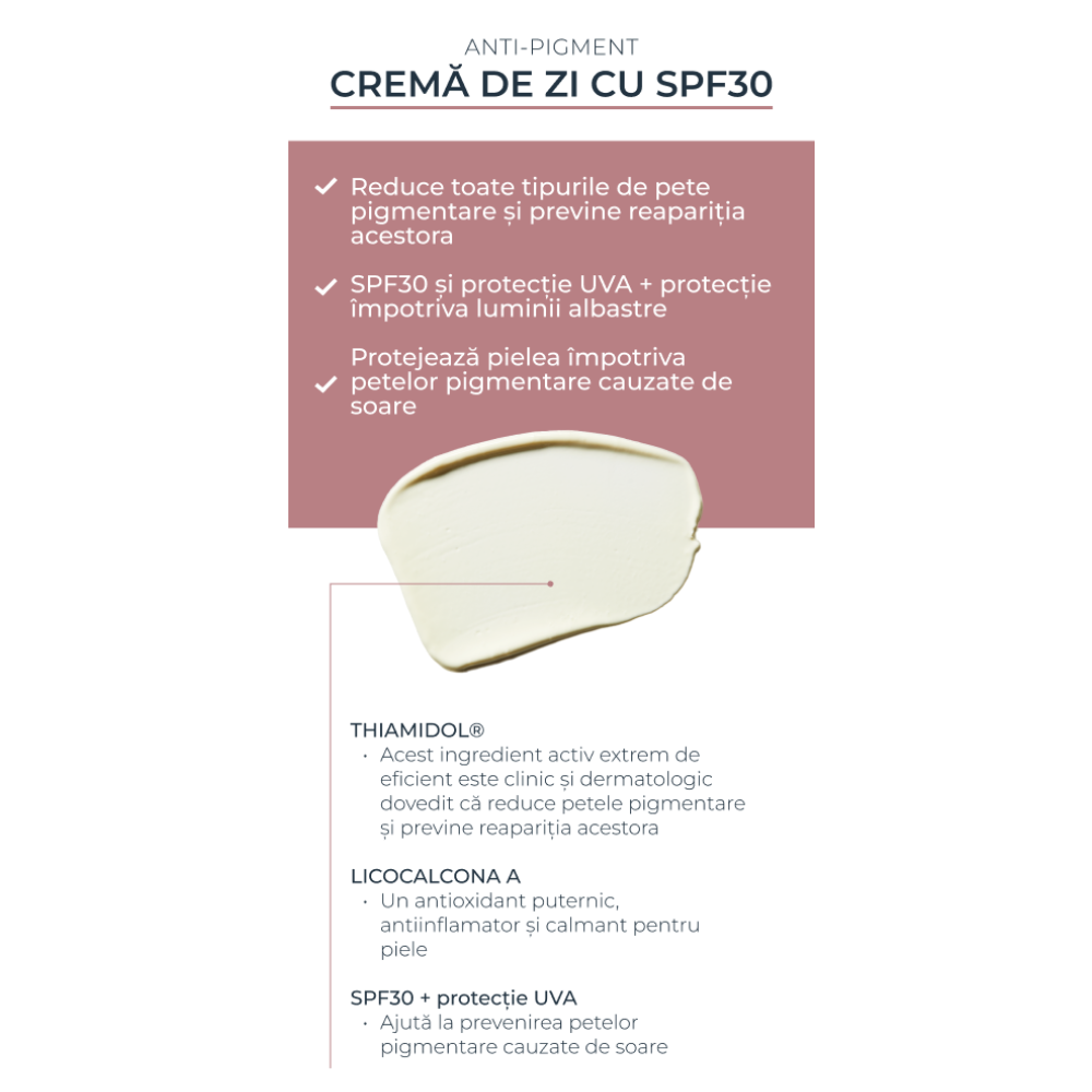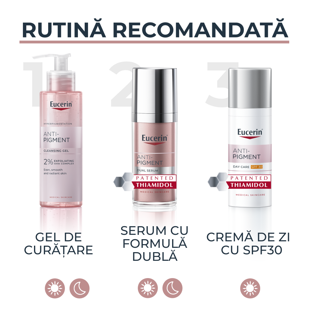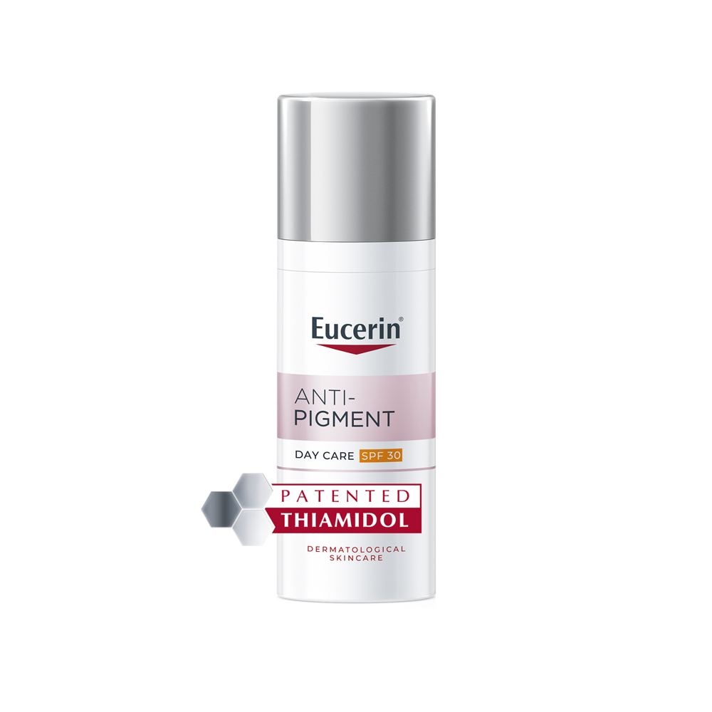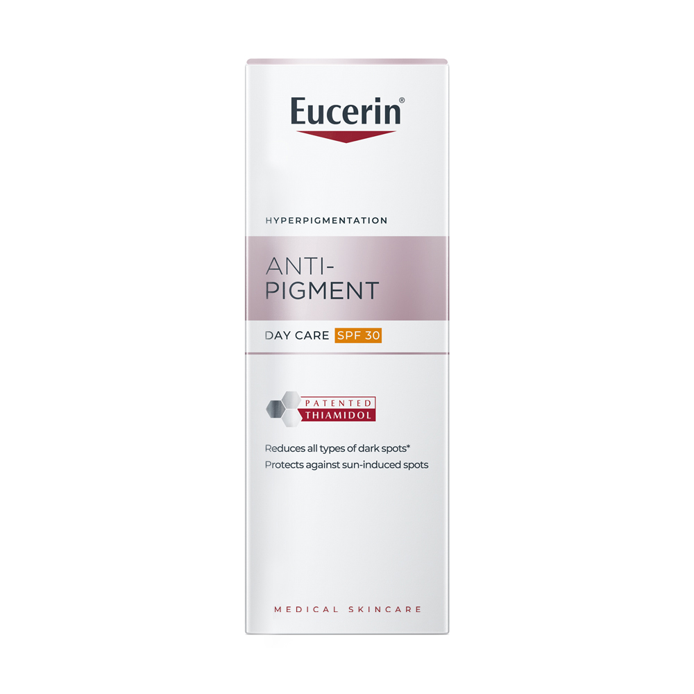 Eucerin Anti-Pigment Cremă de zi SPF 30 este o cremă hidratantă dermatocosmetică, formulată pentru a reduce eficient petele pigmentare și pentru a preveni reaparitia acestora. Conține Thiamidol®, un ingredient patentat care acționează direct asupra cauzei hiperpigmentării – supraproducția de melanină. Cu protecție solară SPF 30, protecție UVA și împotriva luminii albastre, crema combate petele cauzate de soare, vârstă sau dezechilibre hormonale, oferind un ten vizibil mai uniform și luminos încă din primele 2 săptămâni.