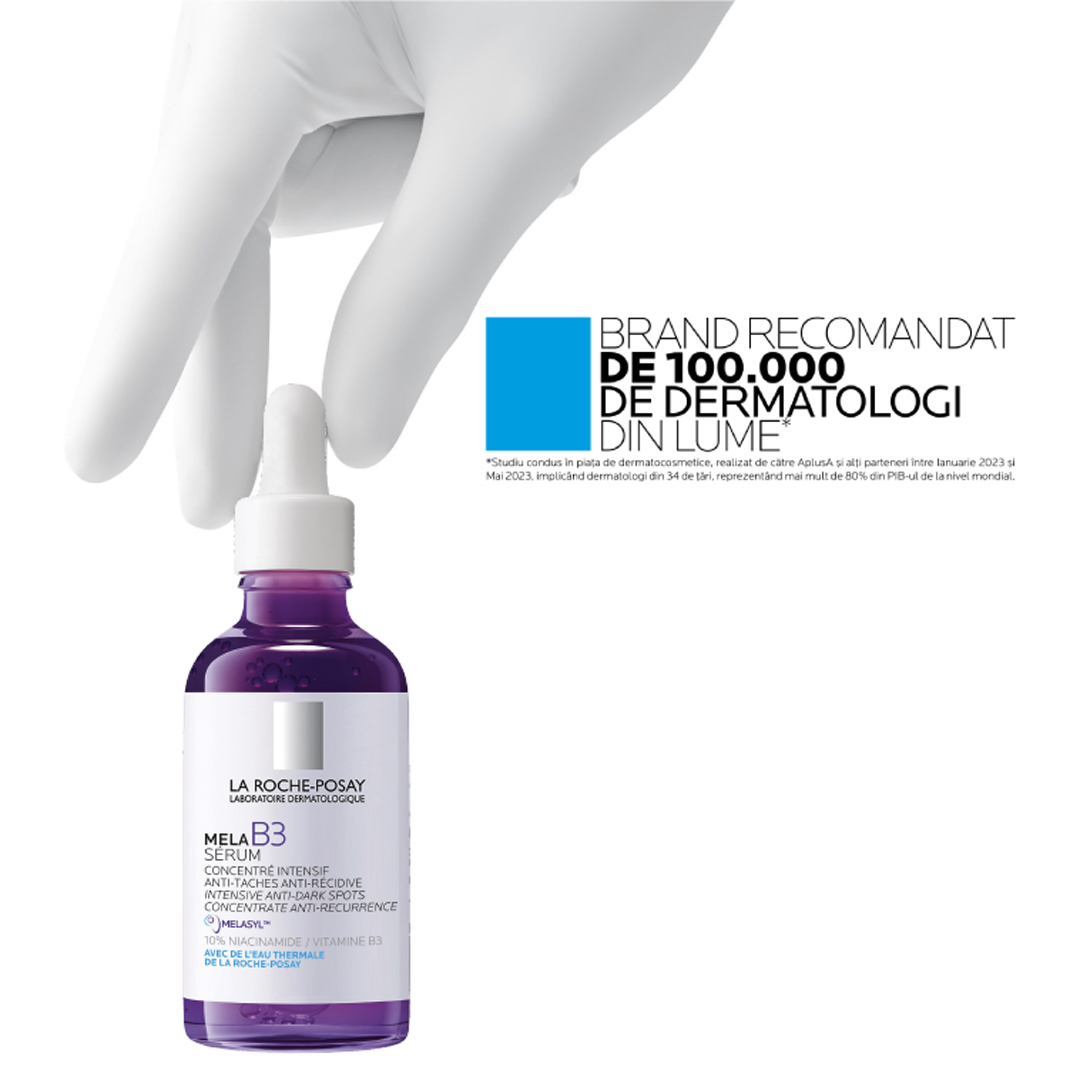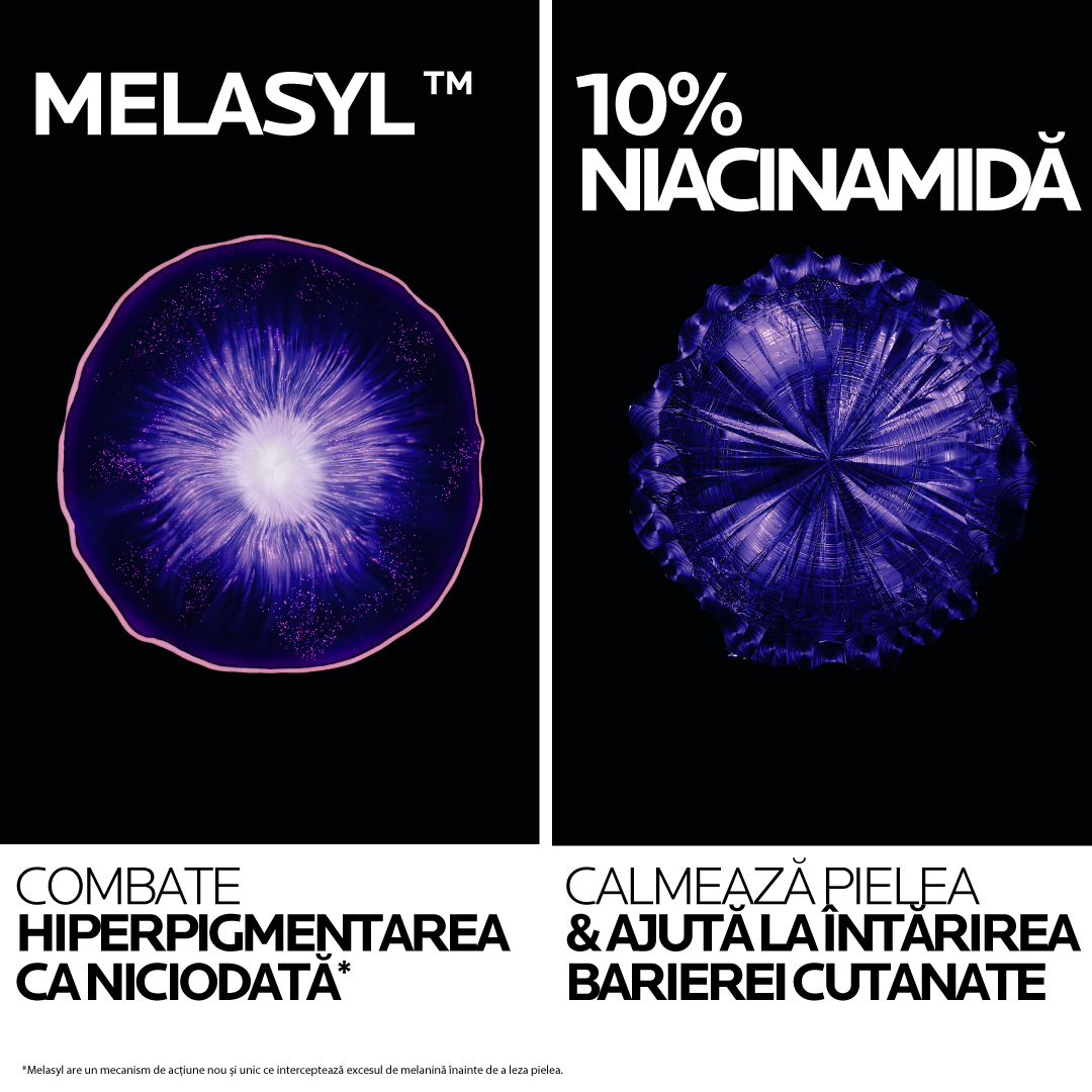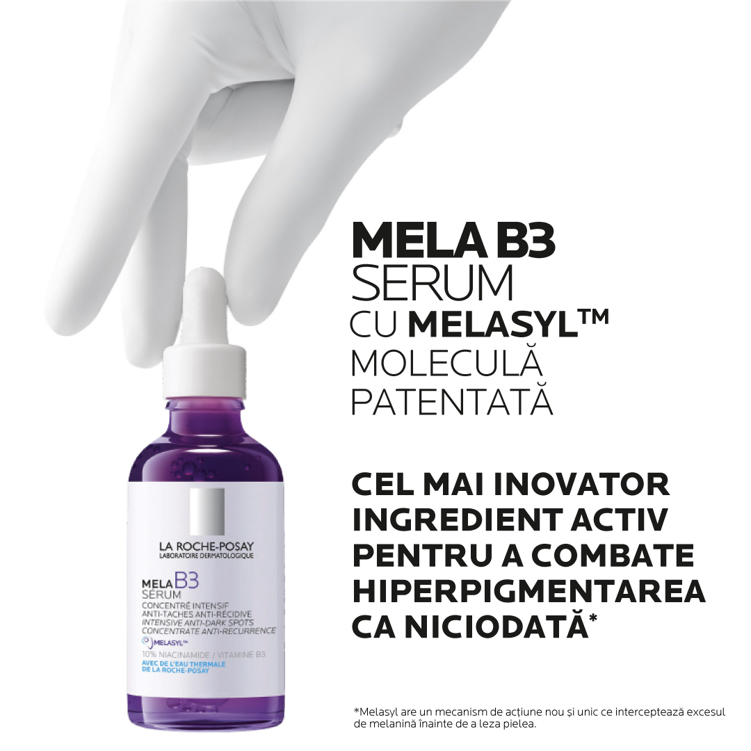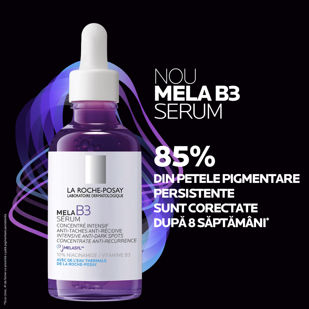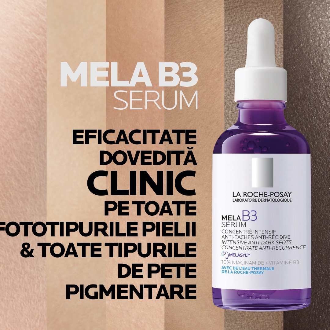 Mela B3 Serum: Ser concentrat intensiv anti-pete pigmentare, anti-recurență cu rezultate vizibile după 1 săptămână*. Dovedit clinic că ajută la corectarea petelor pigmentare, chiar și a celor persistente, pe toate fototipurile pielii și pe toate tipurile de pete pigmentare, inclusiv semnele de foto-îmbătrânire, pete solare, pete post-acnee și post-cicatrici. Formulat cu noul ingredient activ unic și brevetat ce interceptează excesul de melanină înainte de a leza pielea - Melasyl. Uniformizează tonul pielii, a urmelor post-acneice și reduce hiperpigmentarea. Eficacitate optimă. Non-comedogenic. Toleranță foarte bună chiar și pentru pielea sensibilă.