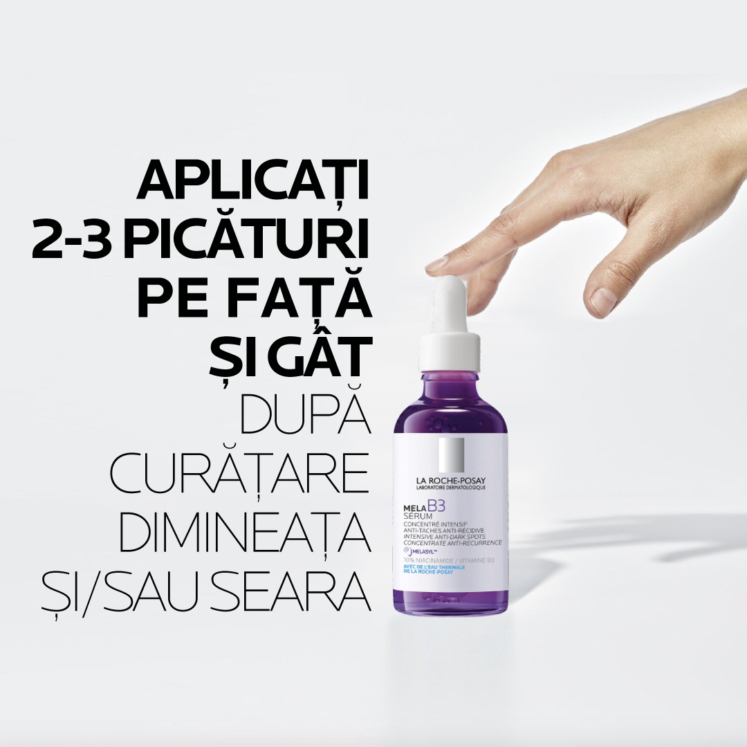 Mela B3 de la La Roche-Posay este un ser concentrat intensiv care oferă o soluție inovatoare pentru corectarea și prevenirea petelor pigmentare. Cu rezultate vizibile în doar o săptămână, acest ser este formulat pentru a combate eficient petele persistente și a uniformiza tonul pielii. Ingredientul activ patentat Melasyl™ interceptează excesul de melanină, prevenind deteriorarea pielii, în timp ce Niacinamida fortifică bariera cutanată și calmează pielea. Indiferent de cauza petelor pigmentare - foto-îmbătrânire, expunere solară, post-acnee sau cicatrici - Mela B3 este testat clinic pentru a aduce îmbunătățiri semnificative, fiind non-comedogenic și tolerat excelent chiar și de pielea sensibilă.