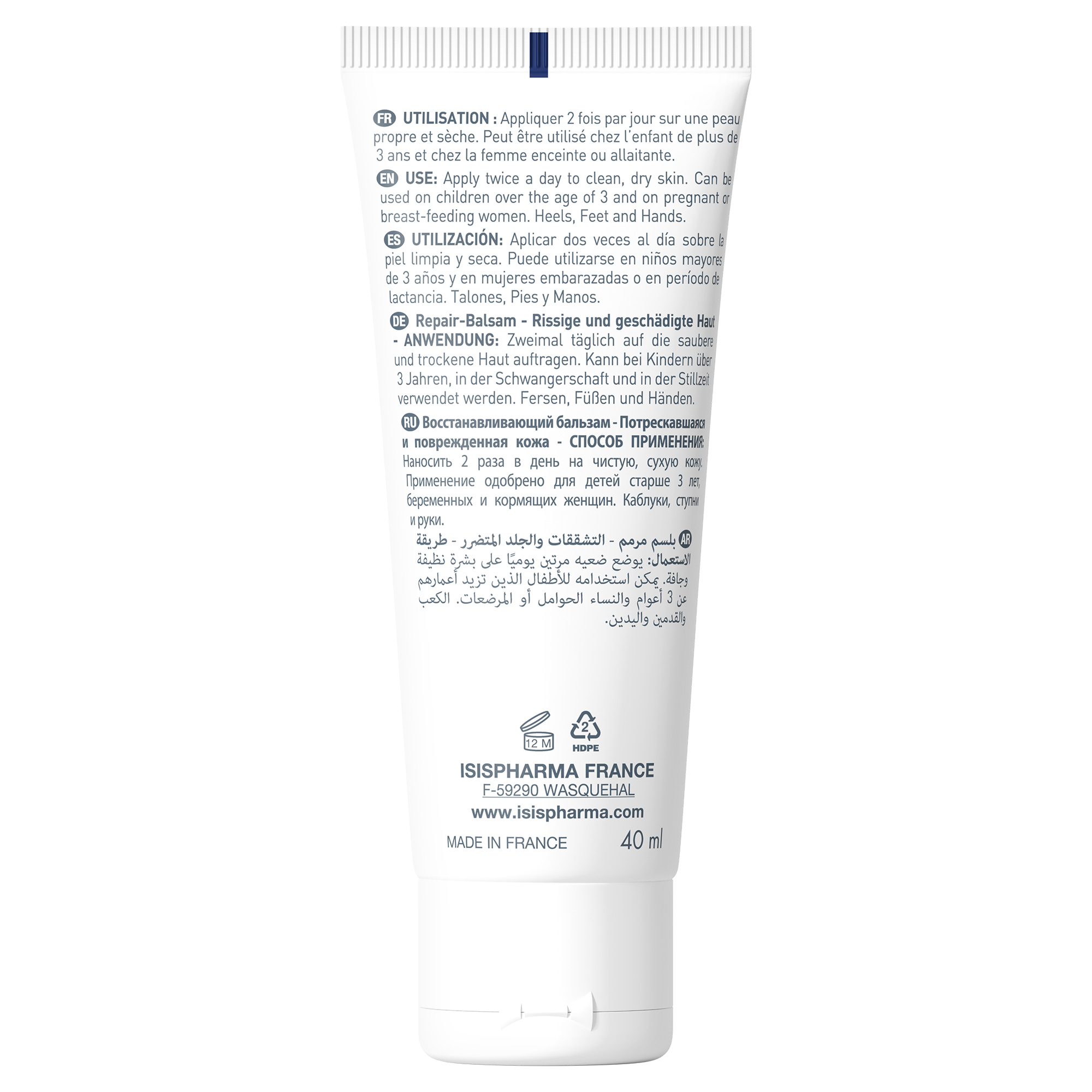 Aplică de una sau mai multe ori pe zi pe zonele uscate sau fisurate, masând până la absorbție pentru a reface bariera cutanată și a calma disconfortul.