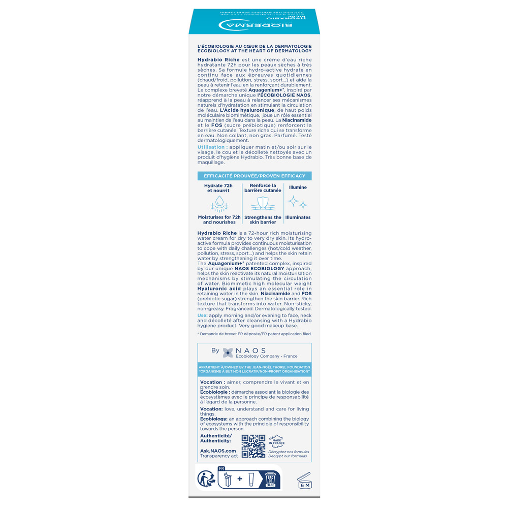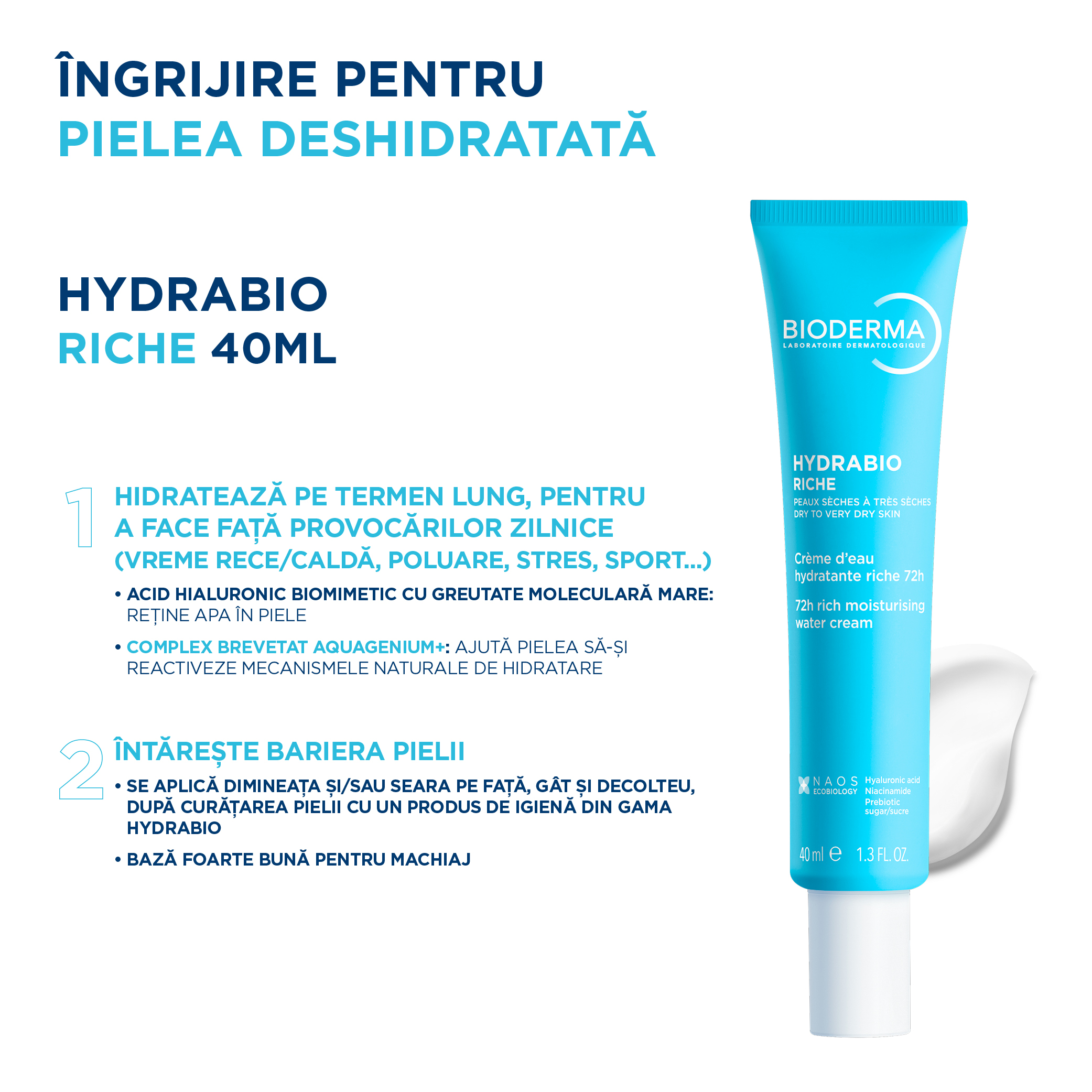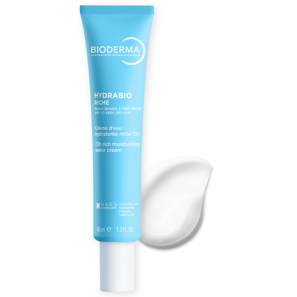 "Hydrabio Riche este o cremă intens hidratantă pe bază de apă, cu acțiune de până la 72 de ore, pentru piele uscată si foarte uscată. Formula sa hidroactivă oferă o hidratare pe