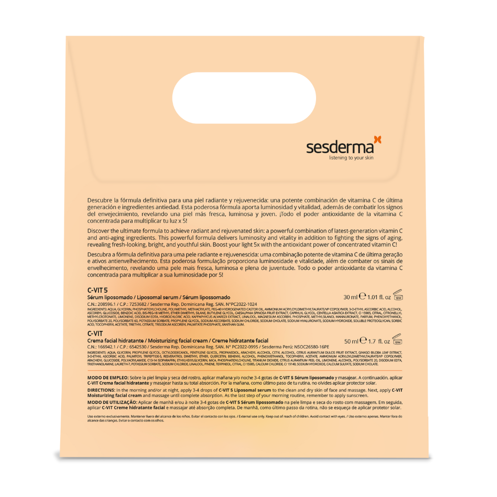 Descopera puterea vitaminei C x5 cu pachetul Sesderma C-VIT, o combinatie premium de ser lipozomal cu 5 tipuri de vitamina C si crema hidratanta pentru fata cu efect antioxidant intens. Gama C-VIT reda luminozitatea naturala a pielii, uniformizeaza nuanta si lupta impotriva semnelor vizibile ale imbatranirii. Datorita tehnologiei lipozomale, ingredientele active patrund in profunzimea pielii, oferind rezultate vizibile: ten radiant, ferm si plin de vitalitate.
