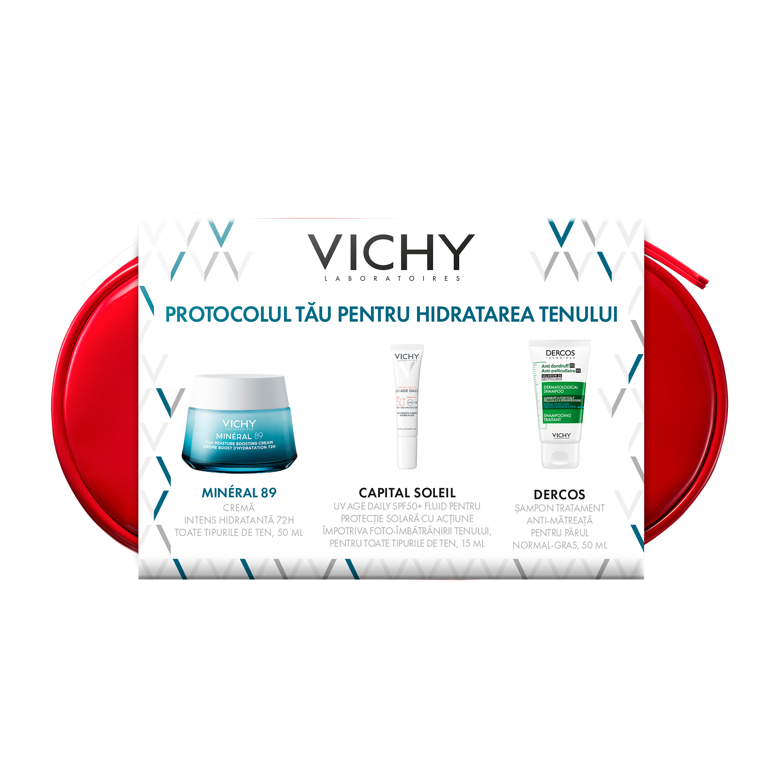 Oferiti cadou Trusa Vichy Minéral 89 Cremă Intens Hidratantă 72H, un set complet pentru hidratare si confort zilnic, potrivit pentru toate tipurile de ten. Piesa centrala este crema cu textura lejera, creata pentru a sustine bariera pielii expusa zilnic factorilor externi si pentru a oferi hidratare de pana la 3 zile, reunind intr-o singura formula apa, minerale, lipide, vitamine si acid hialuronic. Setul este completat de samponul tratament anti-matreata Dercos pentru par normal-gras si de fluidul Capital Soleil UV-AGE DAILY SPF50+, pentru protectie solara ridicata in rutina de zi.