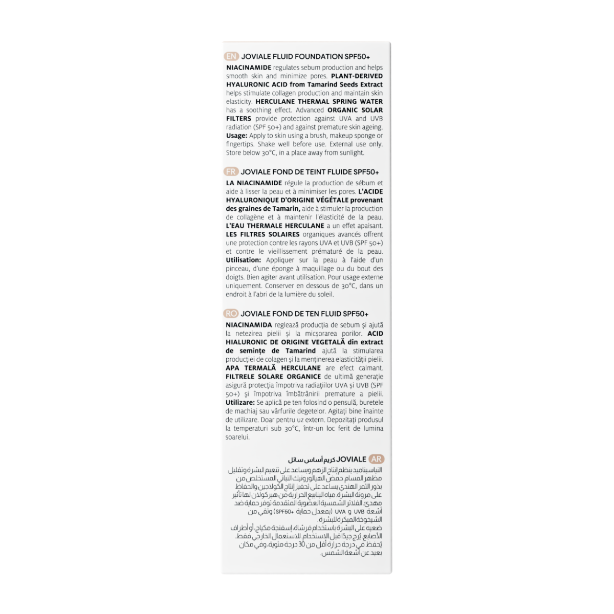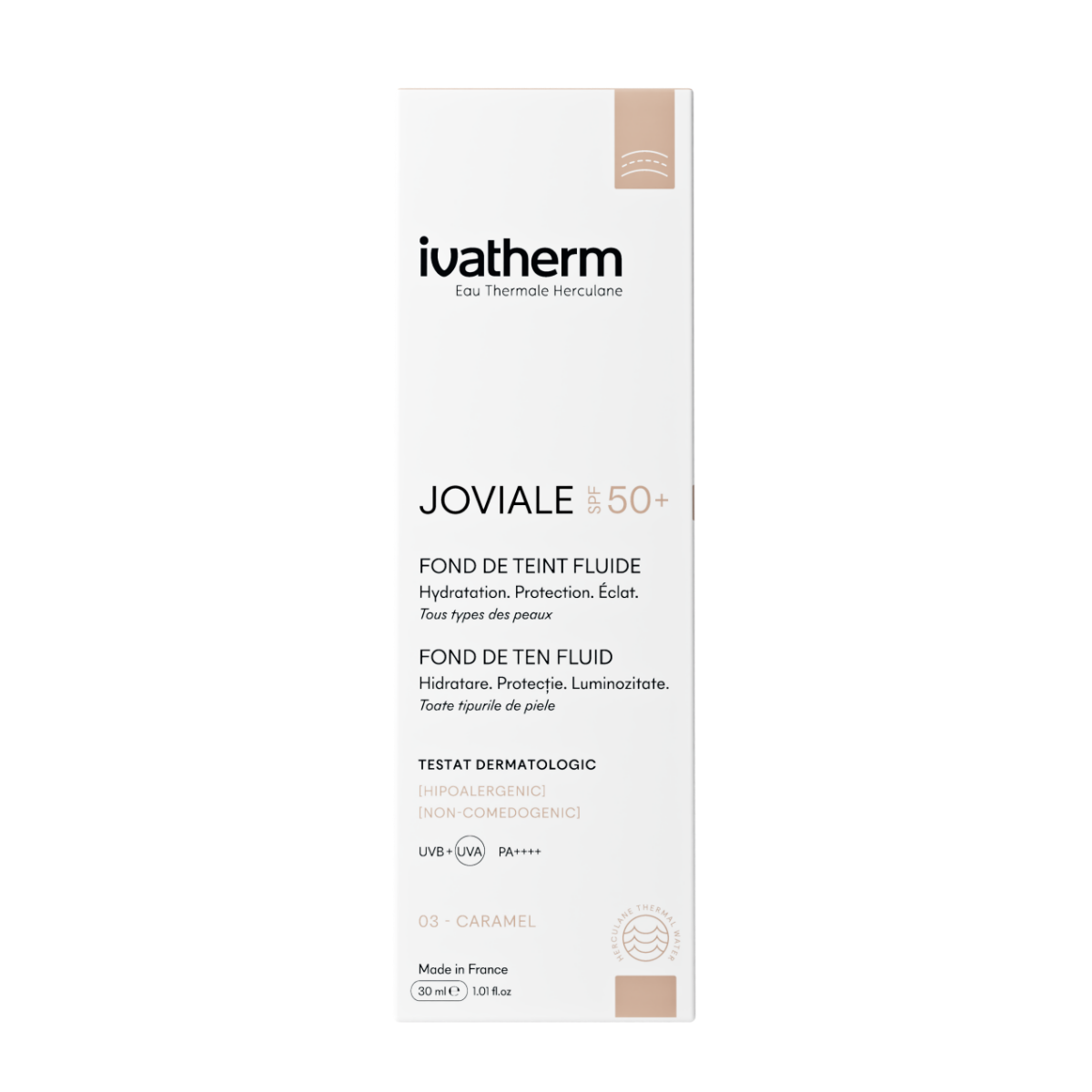Joviale Fond de ten fluid SPF50+ Mineral, nuanta 03 Caramel este un fond de ten dermatocosmetic special formulat pentru pielea sensibila, care combina machiajul cu protectia solara ridicata. Formula sa cu filtre minerale uniformizeaza nuanta tenului, protejeaza pielea impotriva radiatiilor UV si ofera hidratare si confort pe parcursul intregii zile.