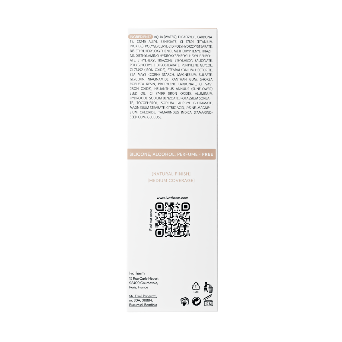 Fondul de ten ofera acoperire medie si un finish natural-glowy, lasand pielea uniforma, luminoasa si cu aspect sanatos. Este potrivit inclusiv pentru pielea sensibila, cu tendinta acneica sau rozacee, fiind non-comedogenic, fara parfum si non iritant pentru ochi.