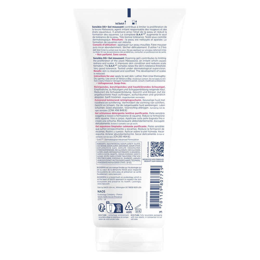 Sensibio DS+ Gel Spumant îmbunătăţeşte condiția pielii şi limitează formarea scuamelor. Complexul DAFTM*, creşte pragul de toleranţă al pielii.