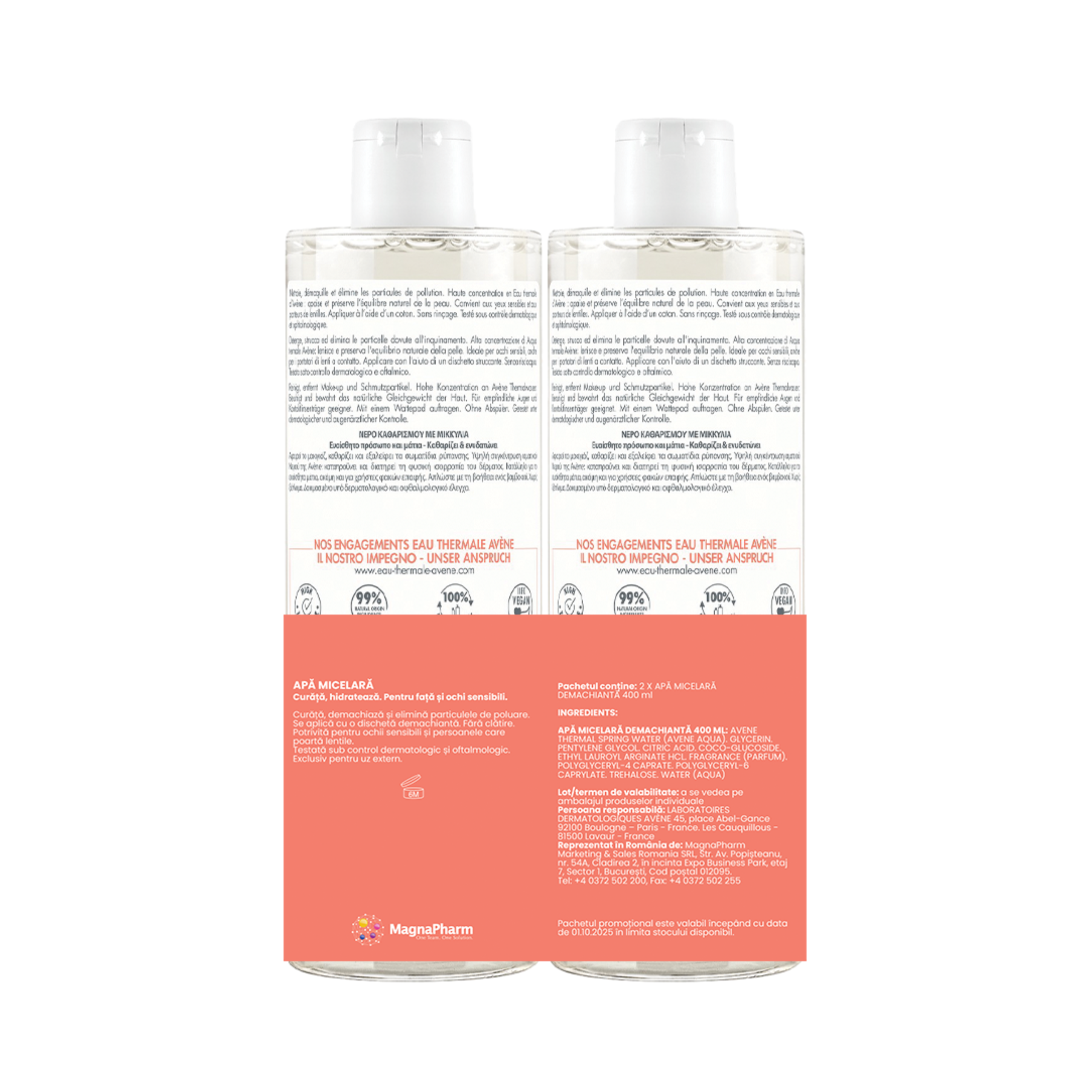 Apa micelara demachianta Avène, cu 99% ingrediente de origine naturala, curata eficient machiajul, impuritatile si particulele de poluare, lasand pielea hidratata, catifelata si calmata. Formula sa delicata, imbogatita cu apa termala Avène, glicerina si trehaloza, respecta echilibrul natural al pielii sensibile si este potrivita inclusiv pentru zona ochilor si pentru purtatorii de lentile de contact. Ambalaj realizat majoritar din materiale reciclate, pentru un consum responsabil.