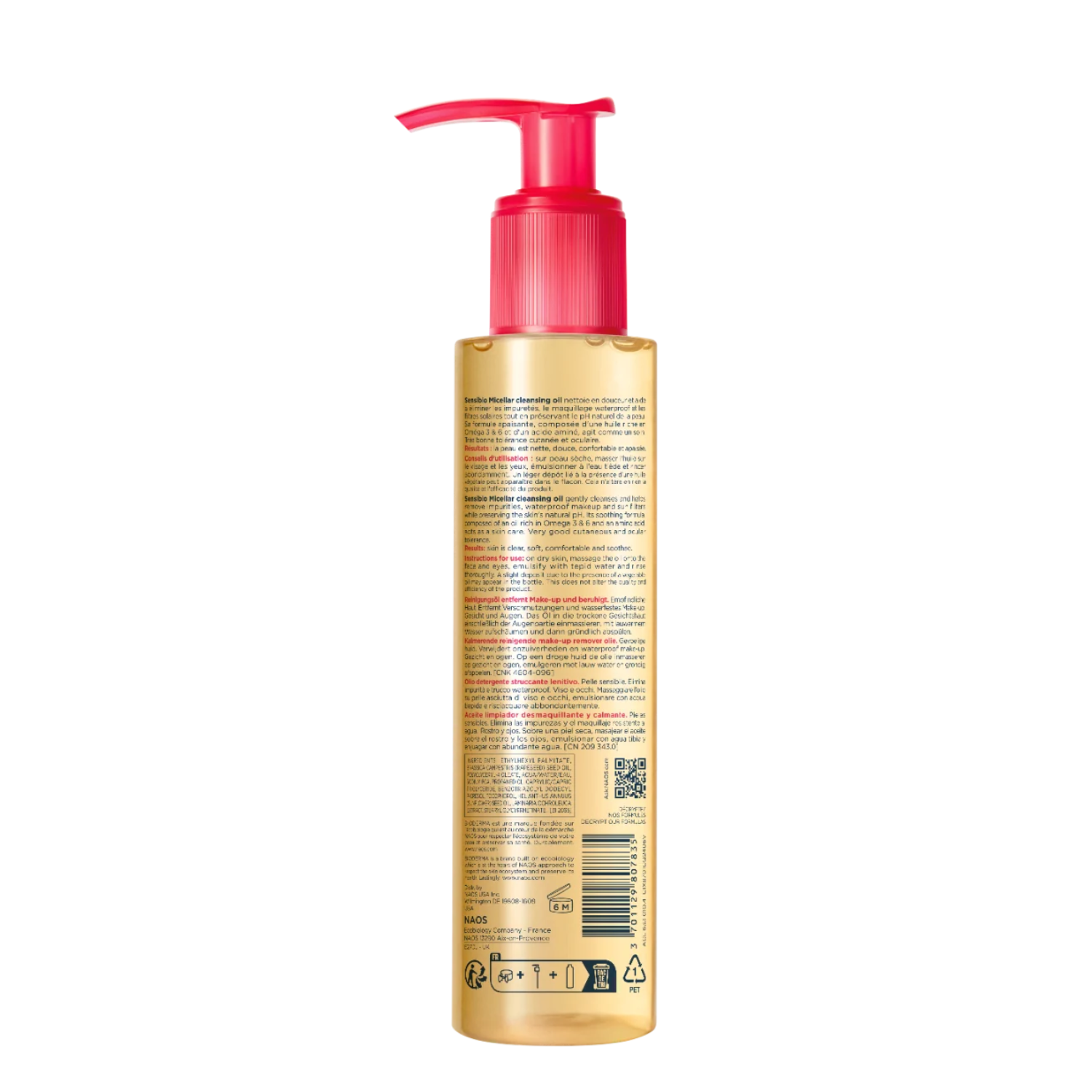 Bioderma ulei micelar de curățare Sensibio ajută la îndepărtarea impurităților, a machiajului rezistent la apă și a filtrelor solare din produsele de fotoprotecție păstrând în același timp pH-ul natural al pielii. Formula sa calmantă, compusă dintr-un ulei bogat in OMEGA 3 & 6 și un aminoacid, acționează ca un produs de îngrijire a pielii. Toleranță cutanată și oculară foarte bună.