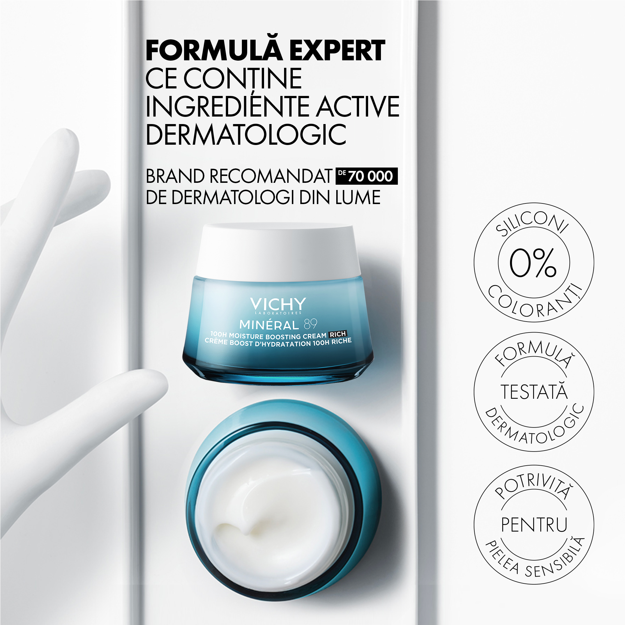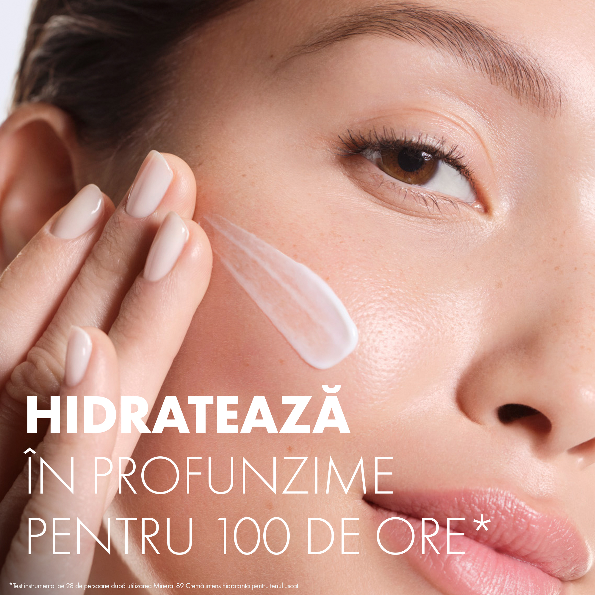 VICHY MINÉRAL 89 Cremă Intens Hidratantă 100H pentru tenul uscat, 50 ml – formulă avansată cu acid hialuronic, apă vulcanică Vichy și vitaminele B și E, oferă hidratare intensă până la 100 de ore și întărește bariera naturală a pielii.