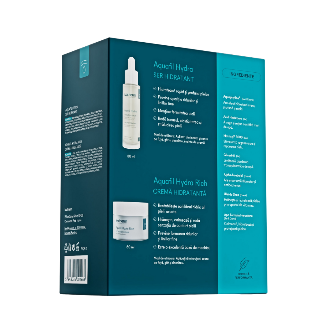 Ultima actualizare a informatiilor de prezentare pentru Pachet Crema hidratanta + Serum cu Peptide si HA Aquafil Hydra Rich, 50 ml + 30 ml, Ivatherm a fost efectuata la data de 14-11-2025.  |  Raporteaza Descriere Gresita