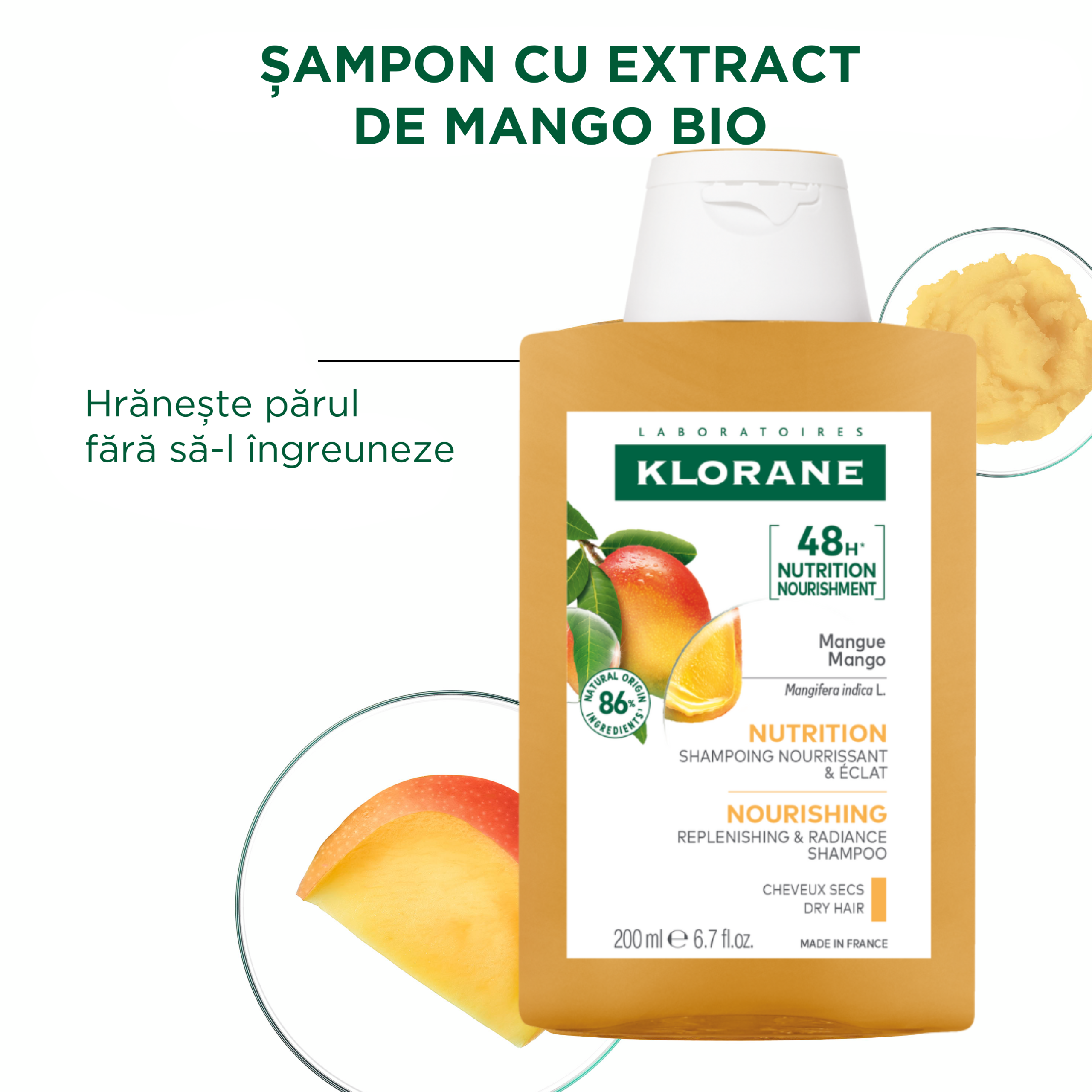 Formulat special pentru părul uscat, tern È™i deshidratat, Klorane Șampon cu extract de mango BIO curăță delicat scalpul È™i redă vitalitatea firelor de păr afectate de uscăciune. Cu o bază de curățare biodegradabilă*, È™amponul combină eficienÈ›a spumei delicate cu beneficiile untului de mango – un ingredient activ vegetal, extrem de bogat în acizi graÈ™i esenÈ›iali. Acesta hrăneÈ™te intens fibra capilară fără să o îngreuneze, lăsând părul moale, suplu È™i strălucitor încă de la prima aplicare. Ideal pentru utilizare frecventă, contribuie la protejarea părului împotriva agresiunilor externe È™i a deshidratării.
