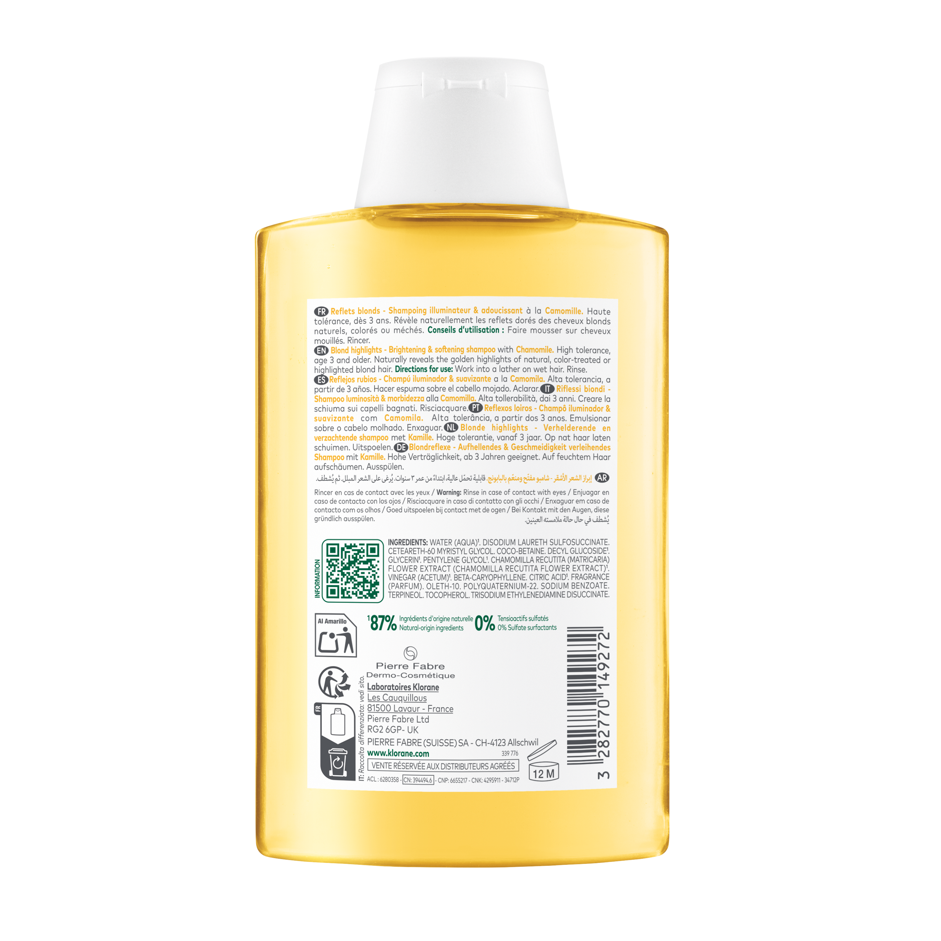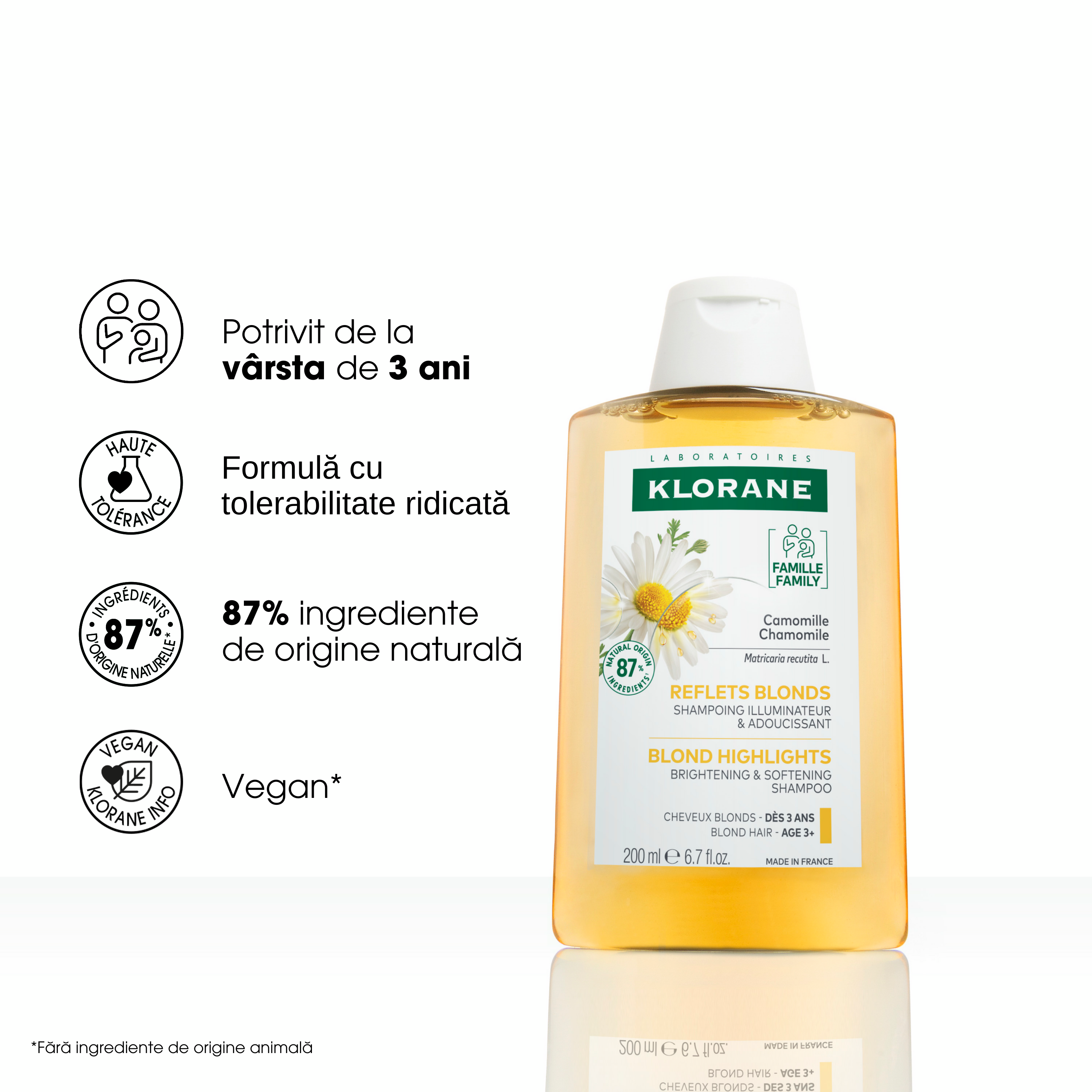 Klorane Șampon cu extract de mușețel BIO este special creat pentru a îngriji părul blond – natural, cu șuvițe sau vopsit – oferindu-i luminozitate și reflexe aurii discrete. Formula sa conține 85% ingrediente de origine naturală, este biodegradabilă și are o toleranță ridicată, fiind potrivită pentru întreaga familie, începând cu vârsta de 3 ani. Curăță delicat părul datorită bazei de spălare blânde, fără a-l usca sau încărca. Extractul de mușețel BIO, bogat în pigmenți galbeni naturali, iluminează subtil toate nuanțele de blond, lăsând părul moale, curat și strălucitor.