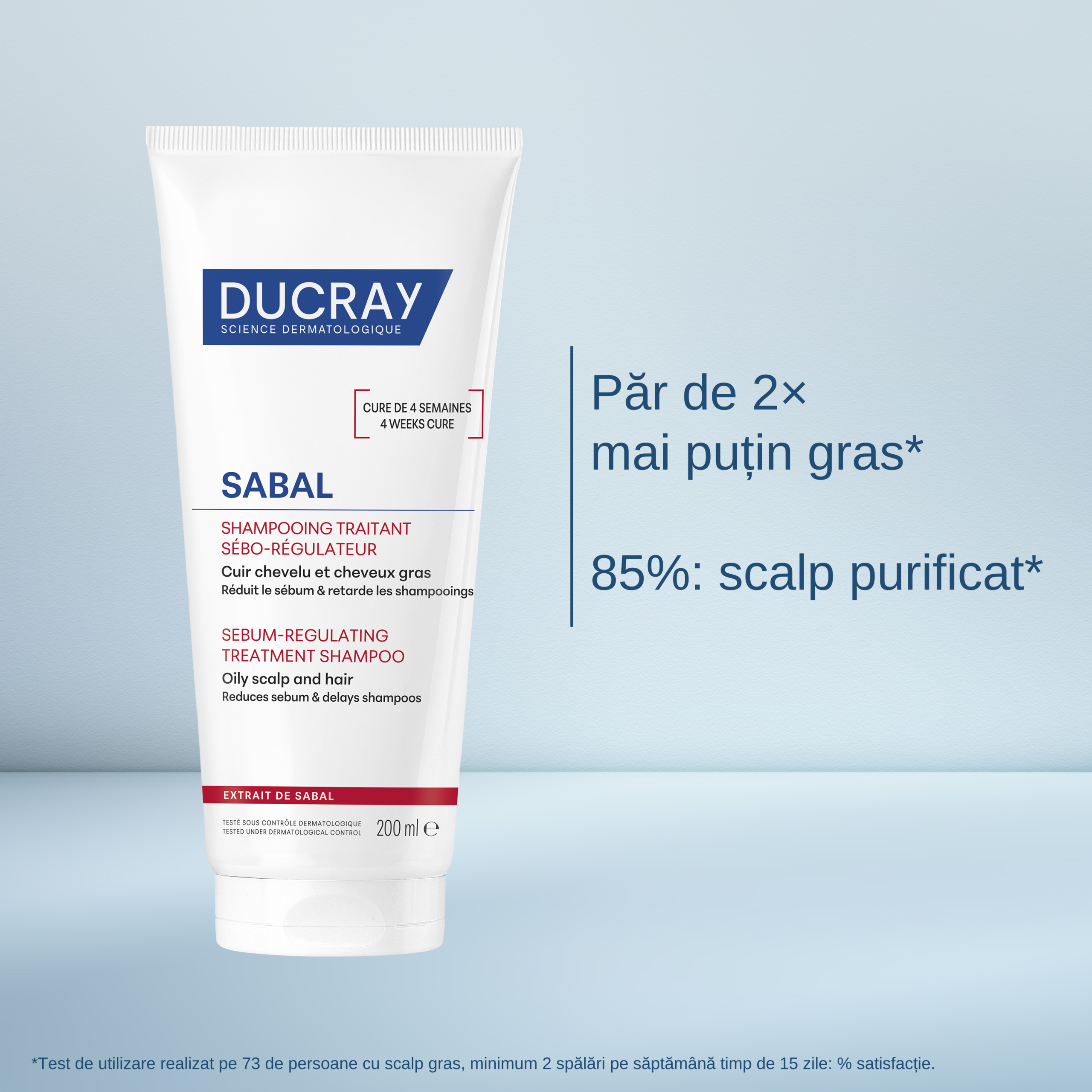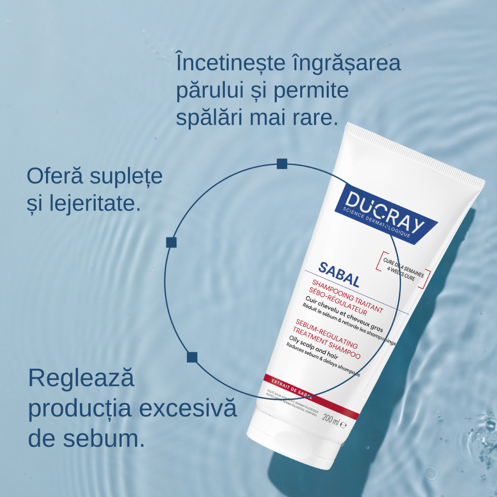 Samponul seboreglator Sabal Ducray este special formulat pentru scalpul si parul gras, cu tendinta de ingrasare rapida. Actioneaza eficient asupra excesului de sebum, ajutand la normalizarea secretiei sebacee si la distantarea spalarii parului pana la 3 zile, oferind prospetime, lejeritate si confort de durata.