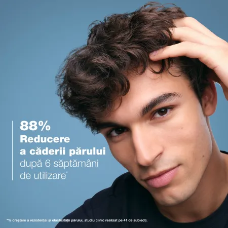 **% satisfactie cu reducerea caderii parului, studiu clinic efectuat pe 41 de subiecti, rezultate dupa 12 saptamani de utilizare.