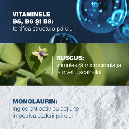 Formula sa biodegradabila actioneaza pentru a intari fibra capilara si astfel incetineste caderea parului. Contine Biotina, vitamina B5, extract de ruscus