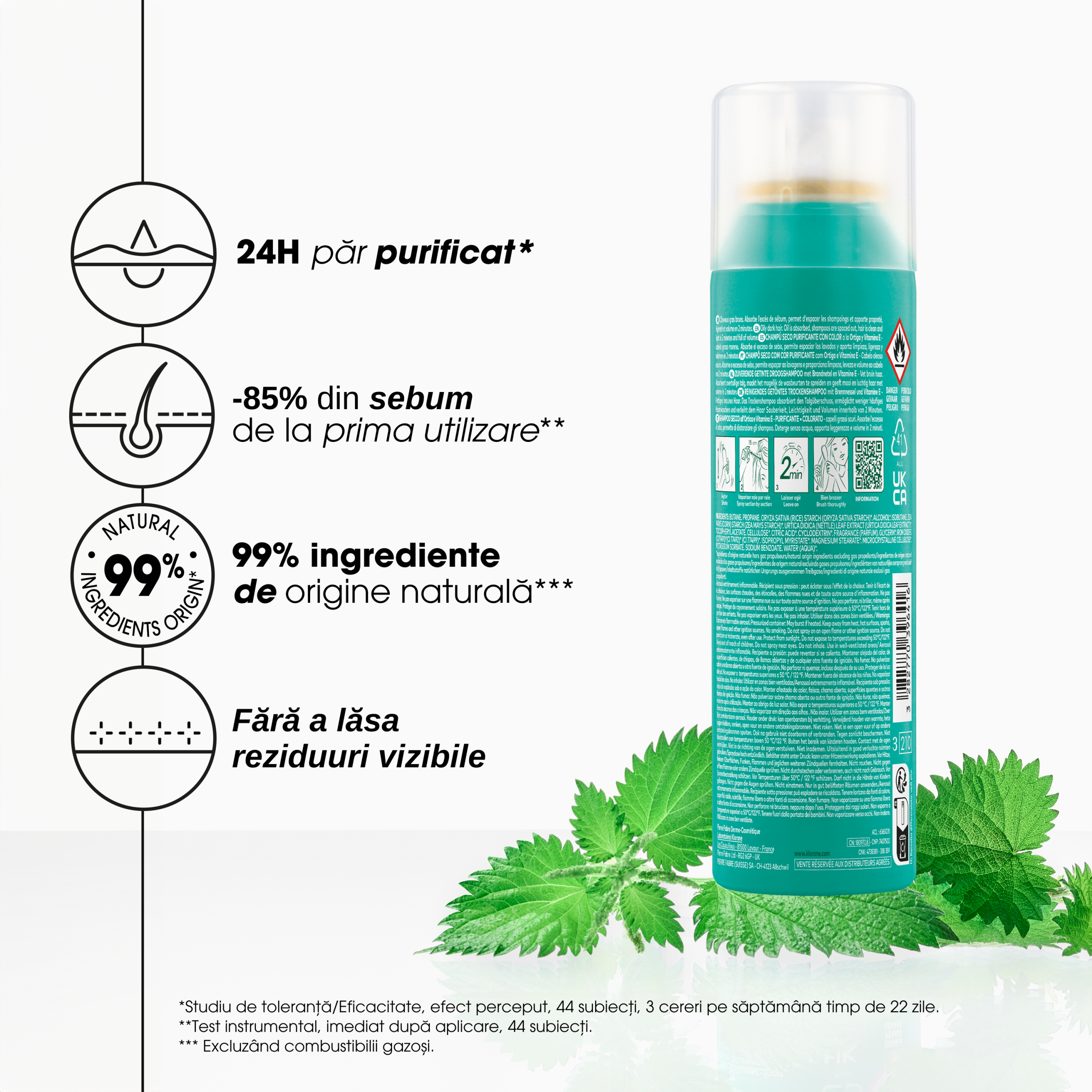 Klorane Șampon uscat nuanțator pentru păr gras cu Urzică și Vitamina E BIO este soluția ideală pentru părul brun cu tendință de îngrășare. Formula inovatoare, pe bază de urzică cu proprietăți seboregulatoare și vitamina E antioxidantă, curăță și purifică scalpul timp de 24 de ore fără a necesita spălare. Datorită pigmenților minerali naturali, produsul nu lasă urme vizibile și se adaptează perfect nuanțelor închise de păr. În doar 2 minute, absoarbe excesul de sebum, oferă volum și redă prospețimea, fără senzație lipicioasă sau reziduuri.