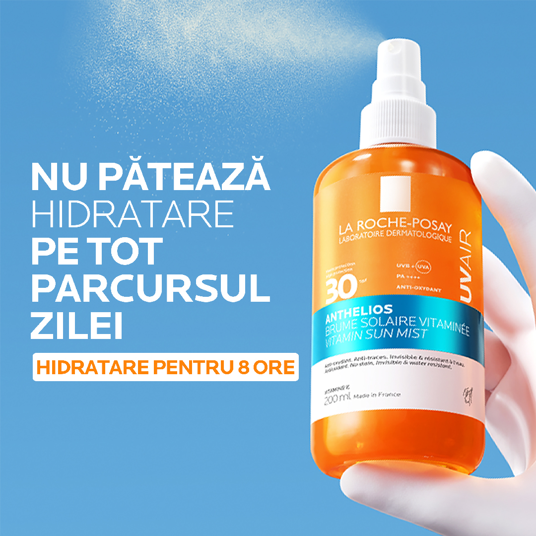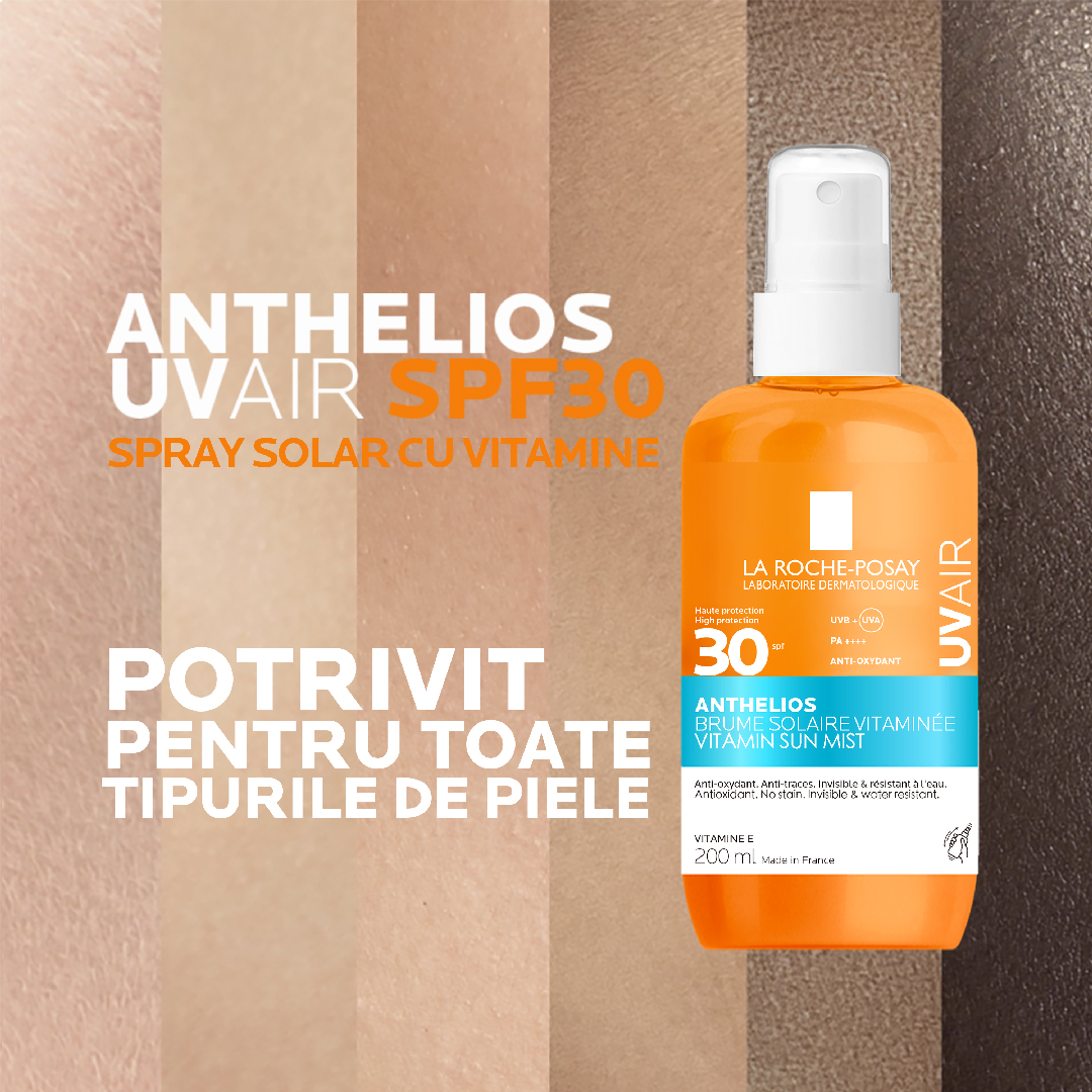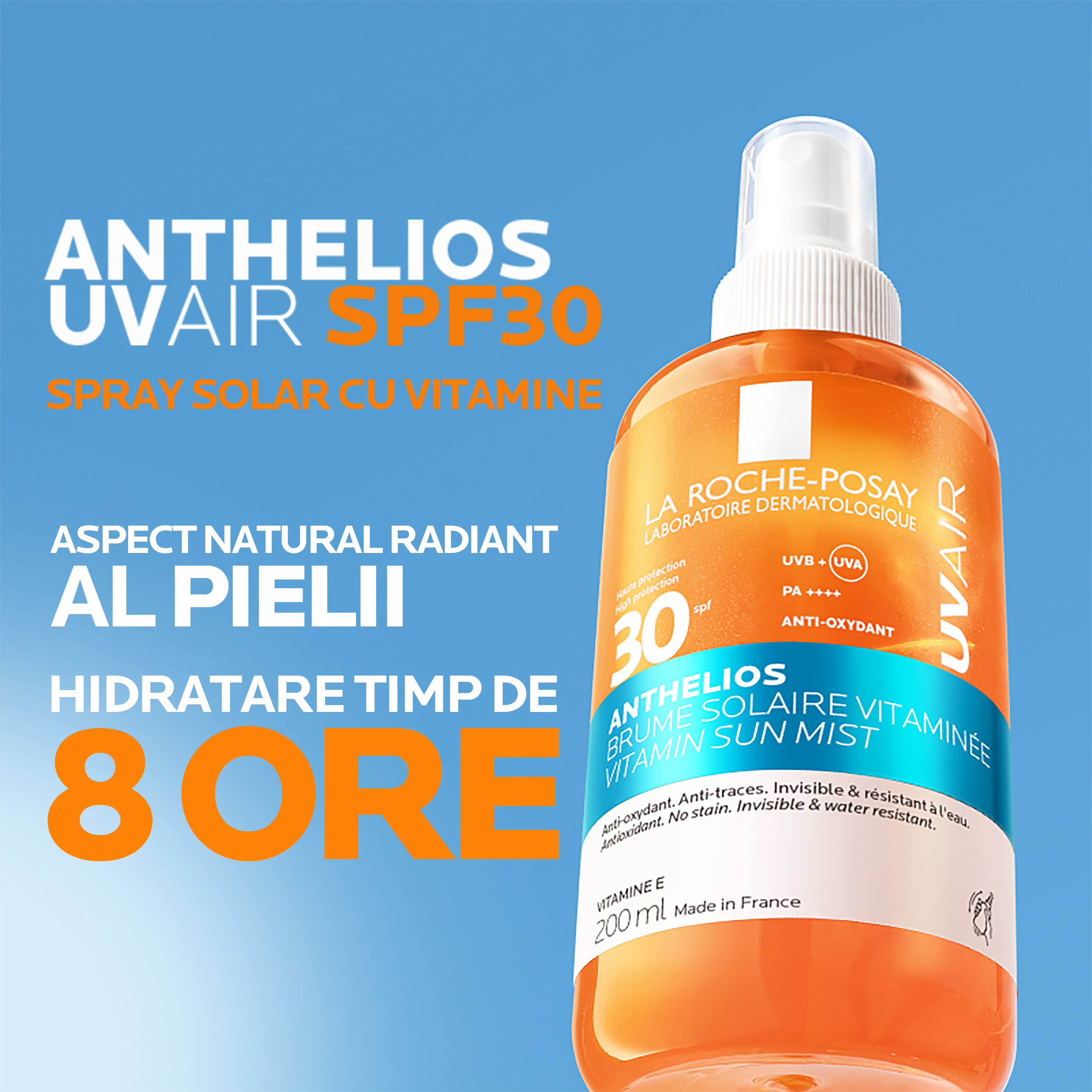 Protecție solară cu spectru larg, special concepută pentru a proteja pielea împotriva efectelor negative produse de radiațiile UVA/UVB. Anthelios UVAir Spray Solar cu Vitamine introduce o formulă bifazică, ce oferă o textură ultra-lejeră și non-lipicoasă. Formula sa combină un sistem de filtre cu protecție ridicată cu un complex de ingrediente active precum Vitamina E cu rol antioxidant și Acid Hialuronic care este menit să mențină pielea hidratată și redensificată pe tot parcursul zilei. Produsul amplifică strălucirea pielii, oferind totodată hidratare continuă tip de 8 ore. Spray-ul nu lasă urme albe sau reziduuri, fiind potrivit pentru toate tipurile de piele. Se recomandă aplicarea chiar înainte de expunerea la soare și reaplicarea frecventă, la fiecare 2 ore, pentru a menține nivelul optim de protecție.
