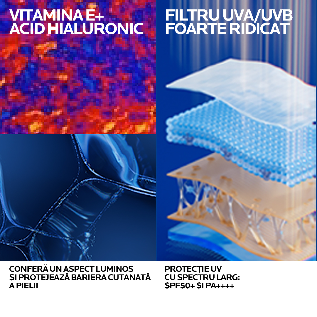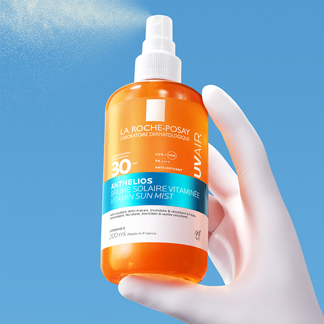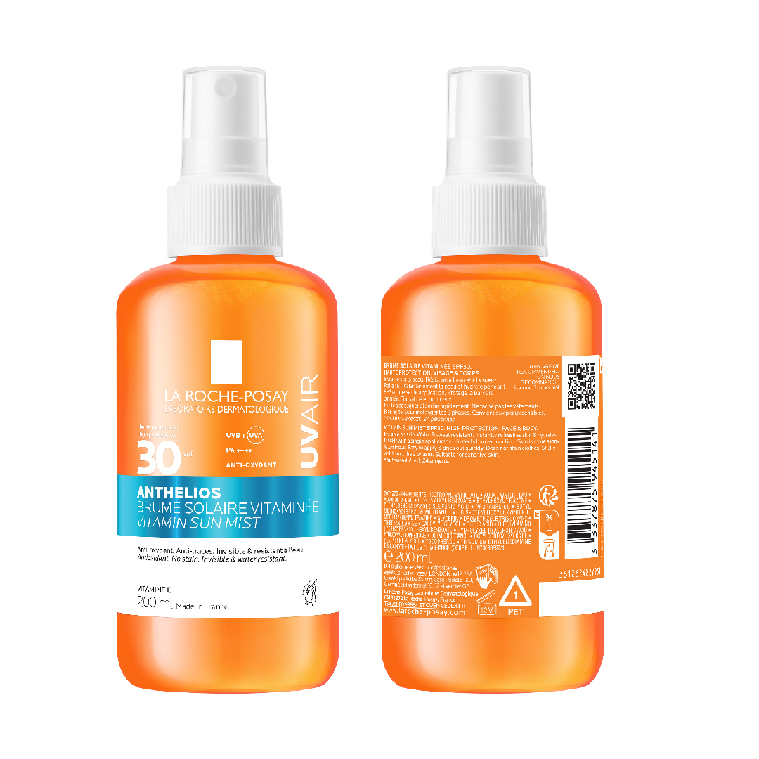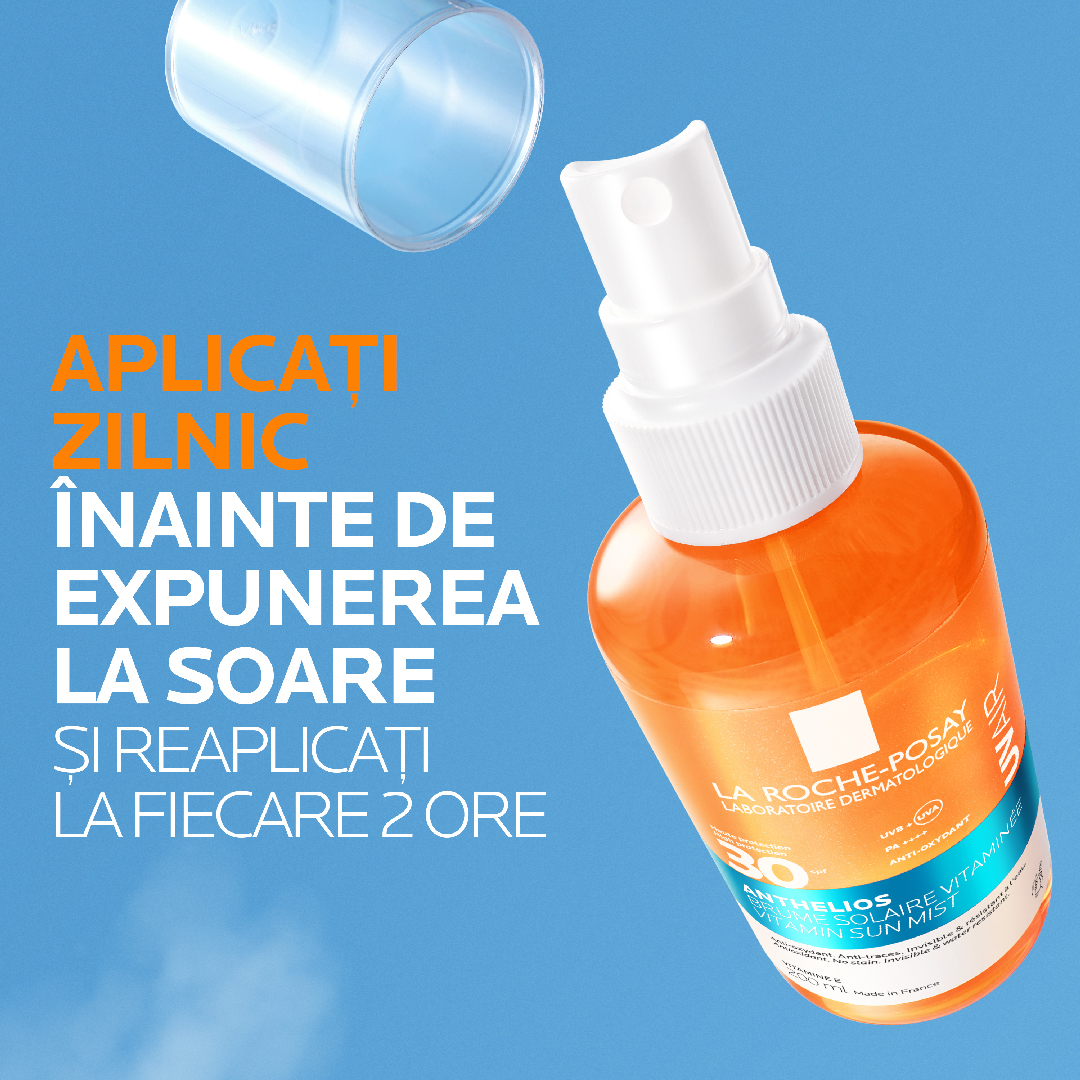 Protecție solară cu spectru larg, special concepută pentru a proteja pielea împotriva efectelor negative produse de radiațiile UVA/UVB. Anthelios UVAir Spray Solar cu Vitamine introduce o formulă bifazică, ce oferă o textură ultra-lejeră și non-lipicoasă. Formula sa combină un sistem de filtre cu protecție ridicată cu un complex de ingrediente active precum Vitamina E cu rol antioxidant și Acid Hialuronic care este menit să mențină pielea hidratată și redensificată pe tot parcursul zilei. Produsul amplifică strălucirea pielii, oferind totodată hidratare continuă tip de 8 ore. Spray-ul nu lasă urme albe sau reziduuri, fiind potrivit pentru toate tipurile de piele. Se recomandă aplicarea chiar înainte de expunerea la soare și reaplicarea frecventă, la fiecare 2 ore, pentru a menține nivelul optim de protecție.