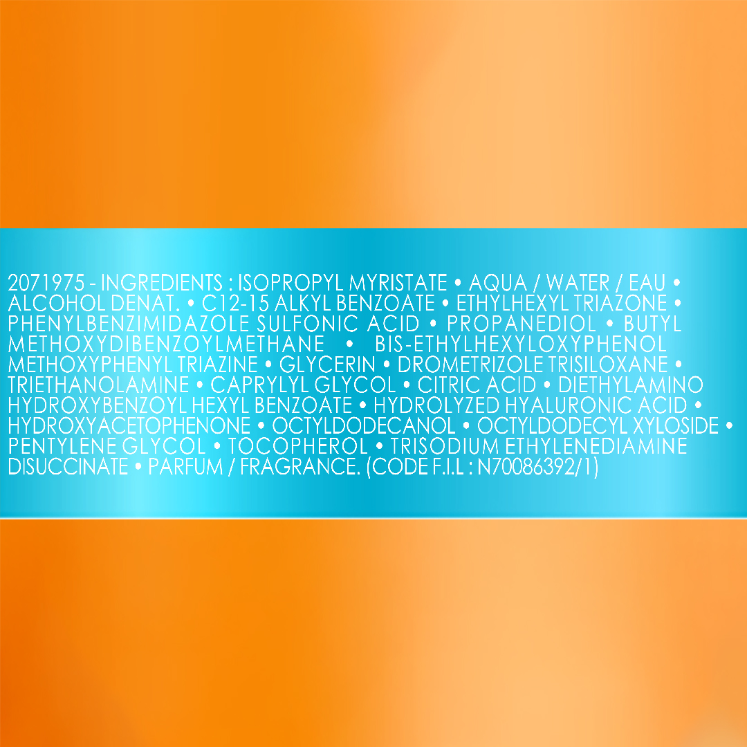 Isopropyl myristate • aqua / water / eau • alcohol denat. • c12-15 alkyl benzoate • ethylhexyl triazone • phenylbenzimidazole sulfonic acid • propanediol • butyl methoxydibenzoylmethane • bis-ethylhexyloxyphenol methoxyphenyl triazine • glycerin • drometrizole trisiloxane • triethanolamine • caprylyl glycol • citric acid • diethylamino hydroxybenzoyl hexyl benzoate • hydrolyzed hyaluronic acid • hydroxyacetophenone • octyldodecanol • octyldodecyl xyloside • pentylene glycol • tocopherol • trisodium ethylenediamine disuccinate • parfum / fragrance.