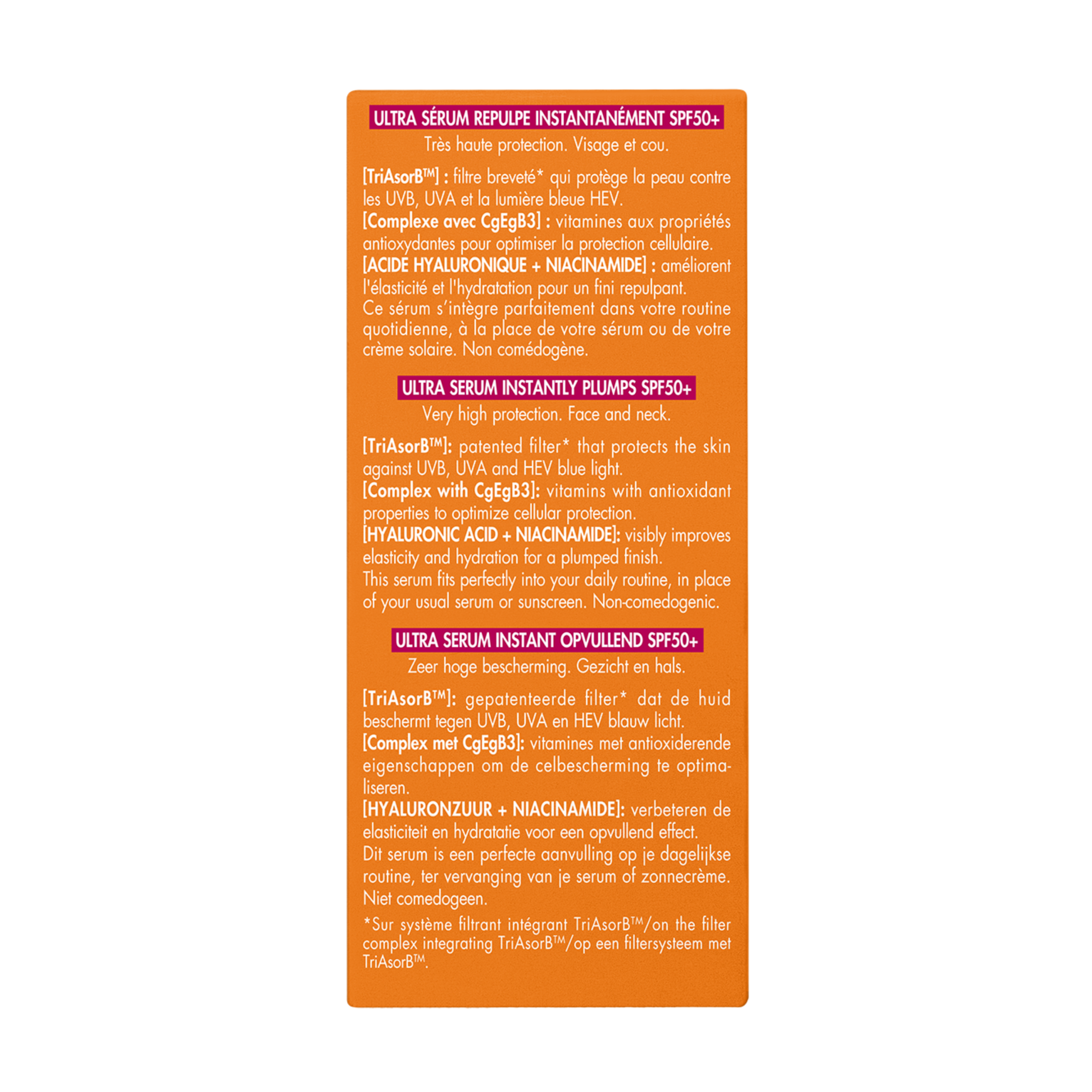Textura ultralejera se absoarbe rapid in piele si ofera un rezultat invizibil, fara senzatie grasa sau lipicioasa. Serul protejeaza pielea impotriva razelor UVB, UVA si a luminii albastre HEV, contribuind in acelasi timp la prevenirea fotoimbatranirii si la mentinerea fermitatii pielii. Poate fi utilizat zilnic ca prim pas in rutina de ingrijire, fiind potrivit pentru toate tipurile de piele, inclusiv pentru pielea sensibila.