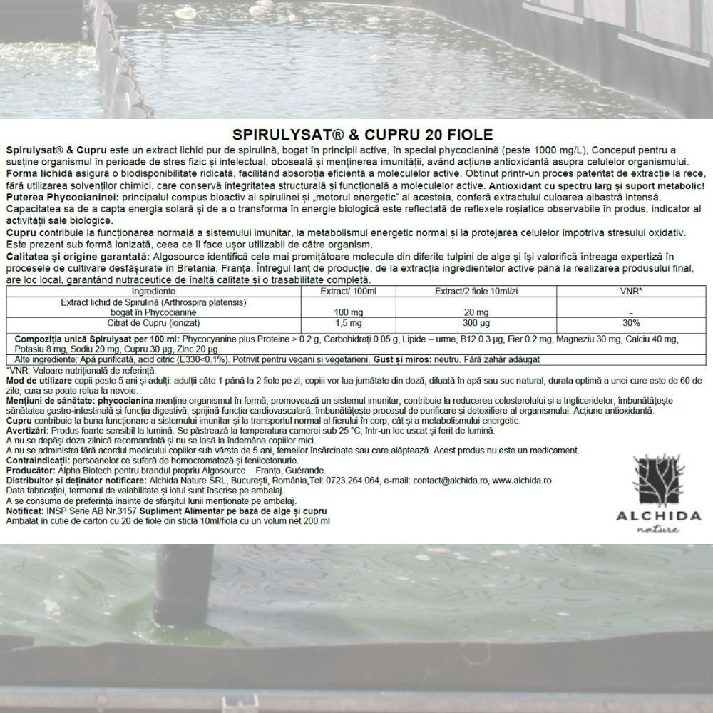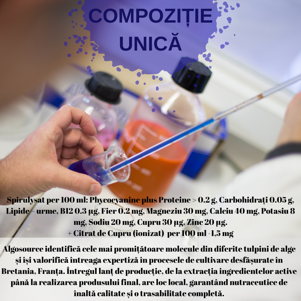 Spirulysat® & Cupru este un extract lichid pur de spirulină, bogat în principii active, în special phycocianină (peste 1000 mg/L). Conceput pentru a susține organismul în perioade de stres fizic și intelectual, oboseală și menținerea imunității, având acțiune antioxidantă asupra celulelor organismului.