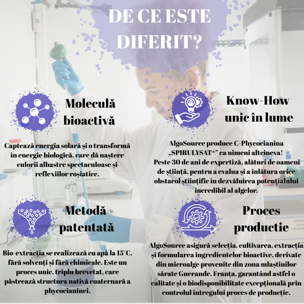 Puterea Phycocianinei: principalul compus bioactiv al spirulinei și „motorul energetic” al acesteia, conferă extractului culoarea albastră intensă. Capacitatea sa de a capta energia solară și de a o transforma în energie biologică este reflectată de reflexele roșiatice observabile în produs, indicator al activității sale biologice.