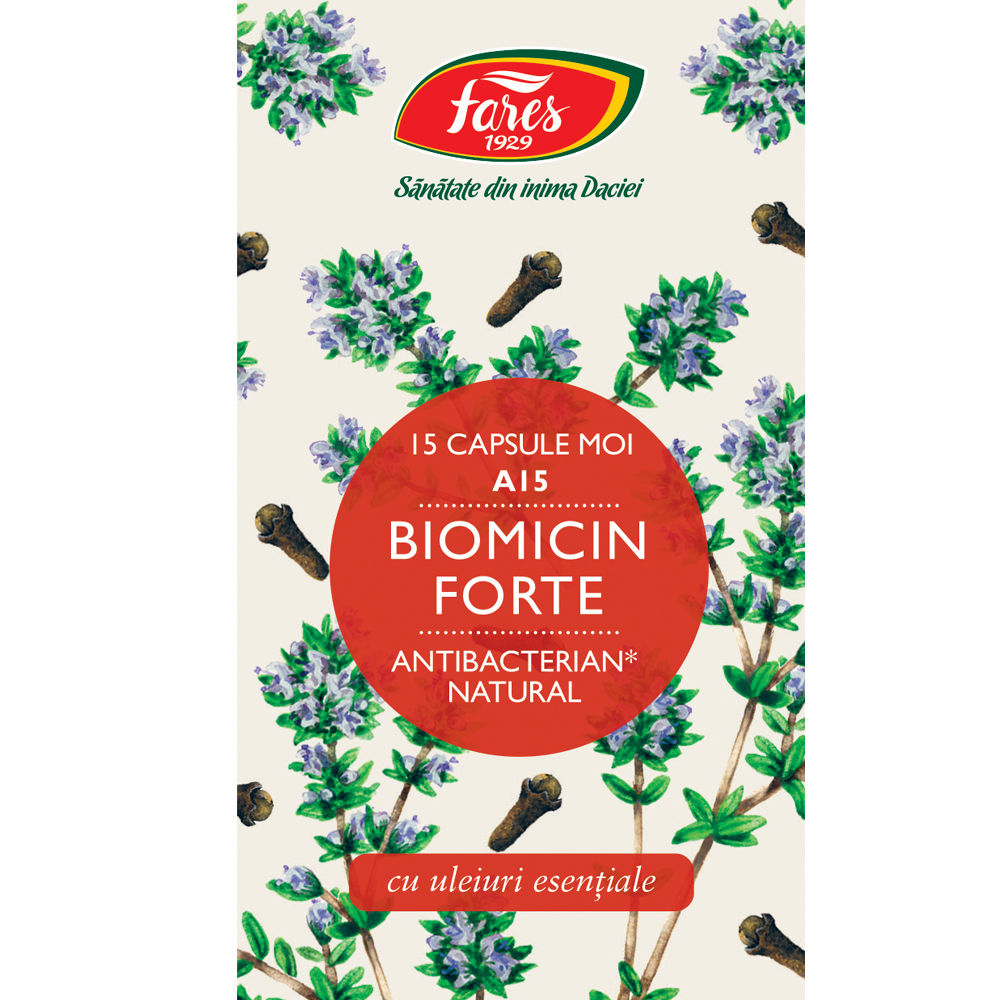 Biomicin Forte A15 Fares este un supliment alimentar pe bază de uleiuri esențiale de cimbru și cuișoare, recunoscute pentru proprietățile lor benefice. Produsul este realizat din ingrediente atent selecționate și este disponibil sub formă de capsule moi, ușor de administrat.
