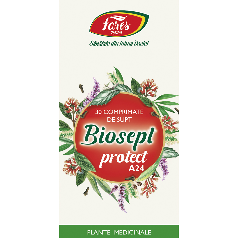 Biosept Protect de la Fares este un supliment alimentar sub formă de comprimate de supt, ce combină extracte și uleiuri esențiale din plante precum eucalipt, mentă, cuișoare și tea tree, conceput pentru a contribui la confortul căilor bucale și faringiene.