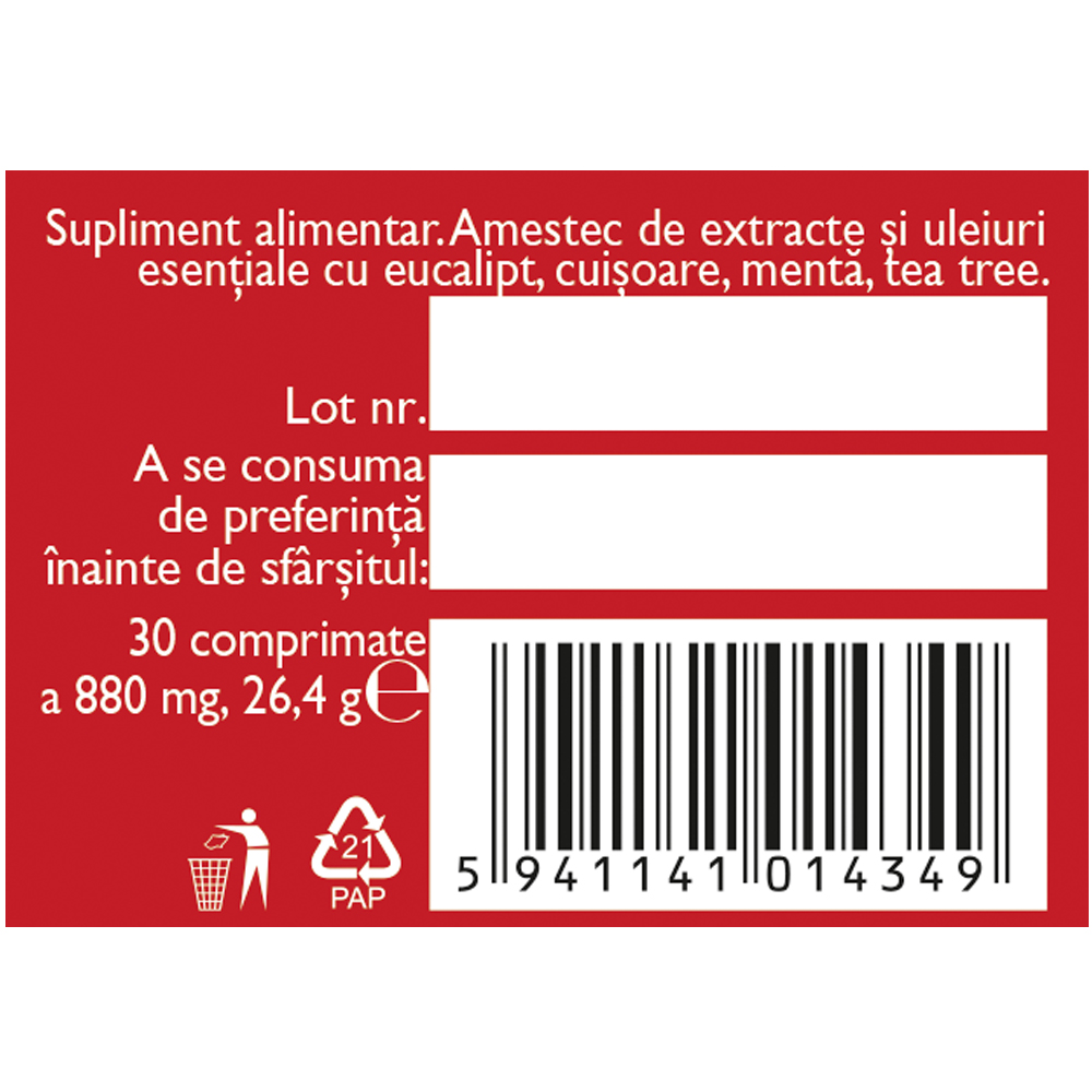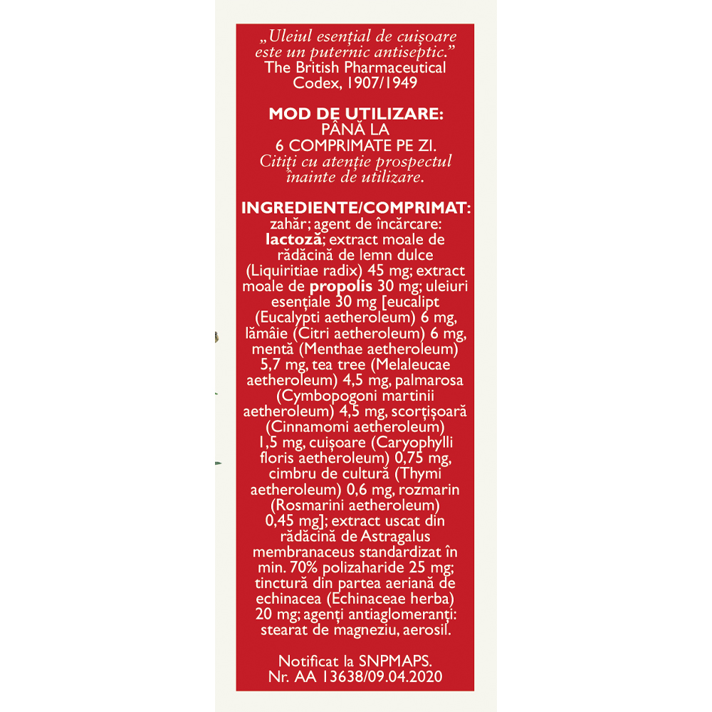 zahăr, agent de încărcare: lactoză, extract moale de rădăcină de lemn dulce (Liquiritiae radix) 45 mg, extract moale de propolis 30 mg, uleiuri esenÈ›iale 30 mg [eucalipt (Eucalypti aetheroleum) 6 mg, lămâie (Citri aetheroleum) 6 mg, mentă (Menthae aetheroleum) 5,7 mg, tea tree (Melaleucae aetheroleum) 4,5 mg, palmarosa (Cymbopogoni martini aetheroleum) 4,5 mg, scorÈ›iÈ™oară (Cinnamomi aetheroleum) 1,5 mg, cuiÈ™oare (Caryophylli floris aetheroleum) 0,75 mg, cimbru de cultură (Thymi aetheroleum) 0,6 mg, rozmarin (Rosmarini aetheroleum) 0,45 mg], extract uscat din rădăcină de Astragalus membranaceus standardizat în min. 70% polizaharide 25 mg, tinctură din partea aeriană de echinacea (Echinaceae herba) 20 mg, agenÈ›i antiaglomeranÈ›i: stearat de magneziu, aerosil.