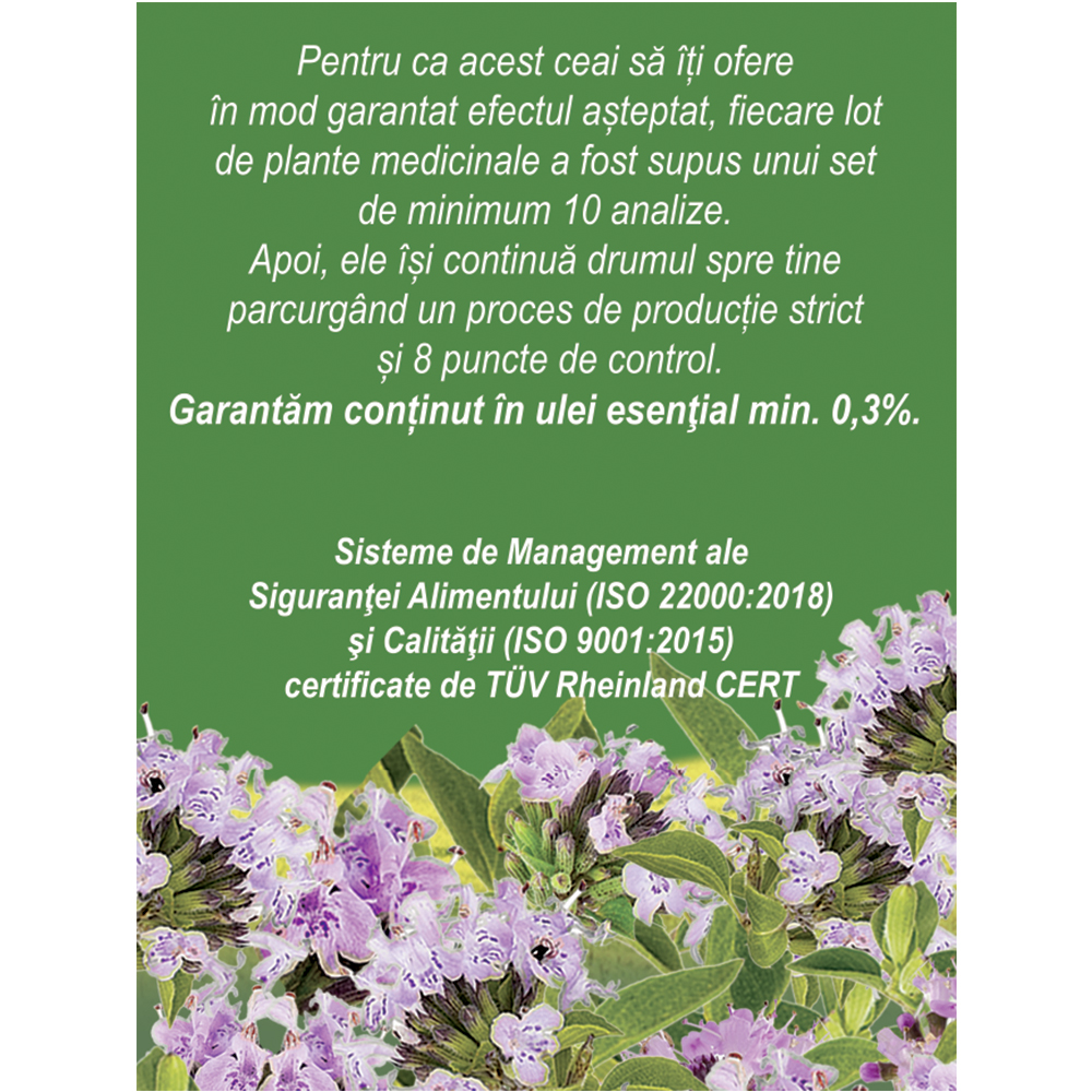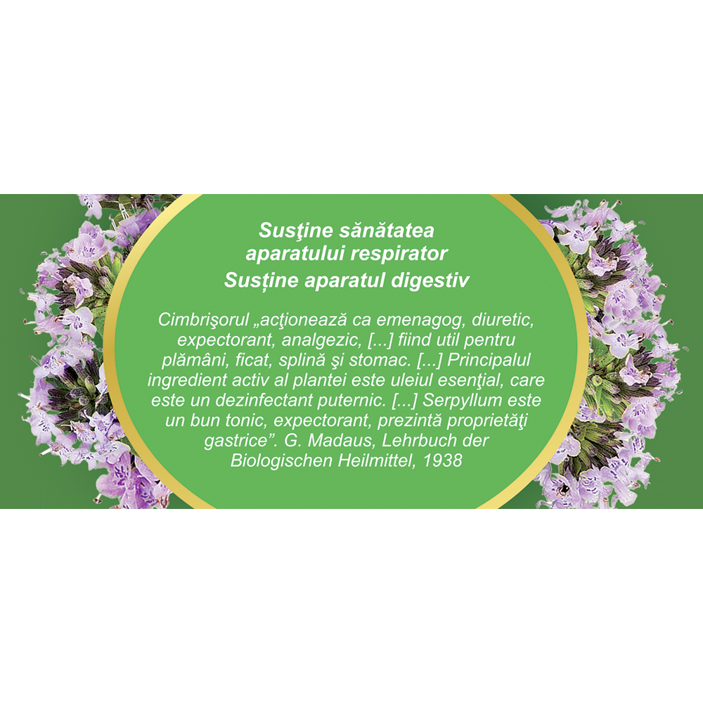 Conține partea aeriană a plantei cimbrisor (Serylli herba).