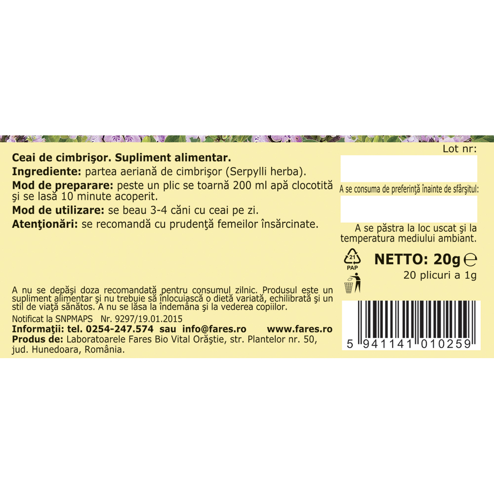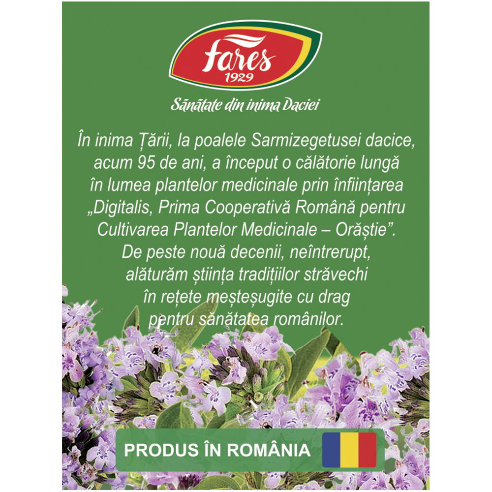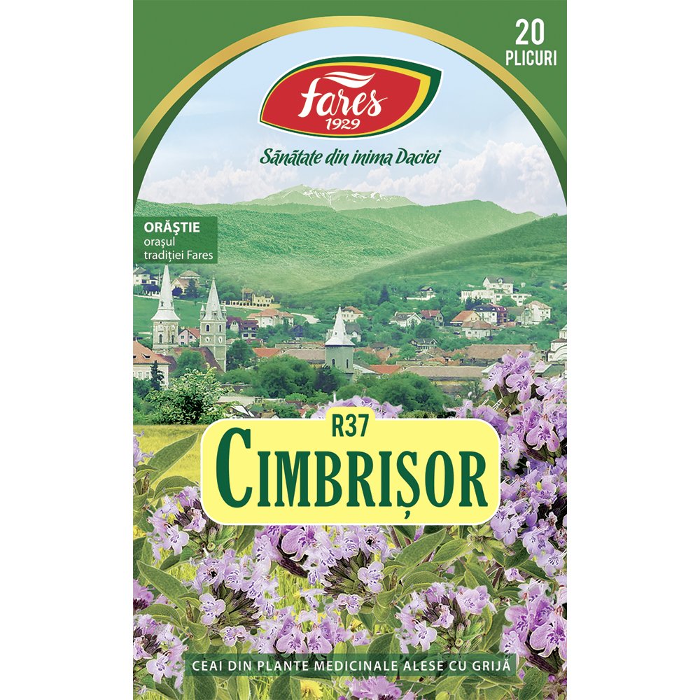 Ceaiul de cimbrisor Fares este un supliment alimentar pe bază de plante, obținut din partea aeriană a cimbrisorului (Serylli herba), recunoscut pentru contribuția sa la susținerea sănătății aparatului respirator și digestiv.