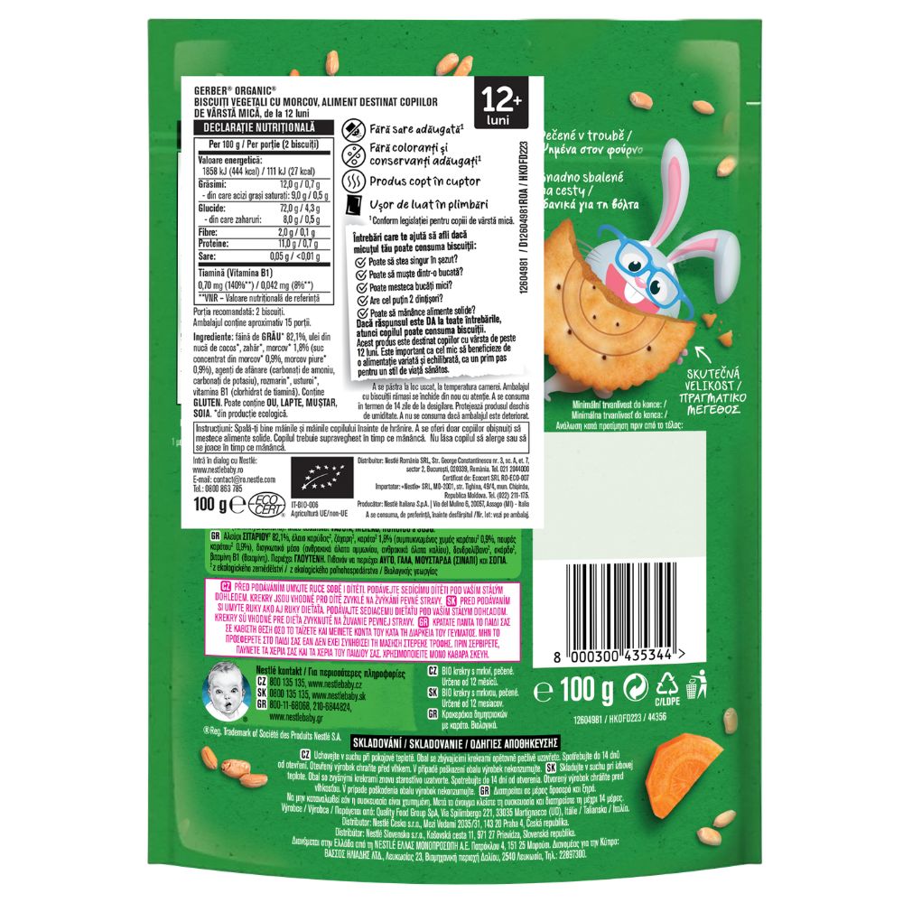 GERBER Organic Crackers cu morcov sunt biscuiți crocanți, realizați din ingrediente provenite din agricultură ecologică, special concepuți pentru copiii de la 12 luni. Au o textură adaptată micuților care încep să mestece alimente solide și un gust delicat, cu note ușoare de morcov.