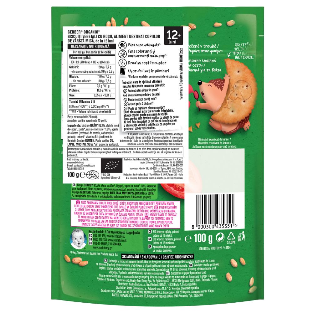 GERBER Organic Crackers cu roșii sunt biscuiți crocanți, realizați din ingrediente provenite din agricultură ecologică, special concepuți pentru copiii de la 12 luni. Au o textură adaptată micuților care încep să mestece alimente solide și oferă o gustare gustoasă, cu aromă delicată de roșii.