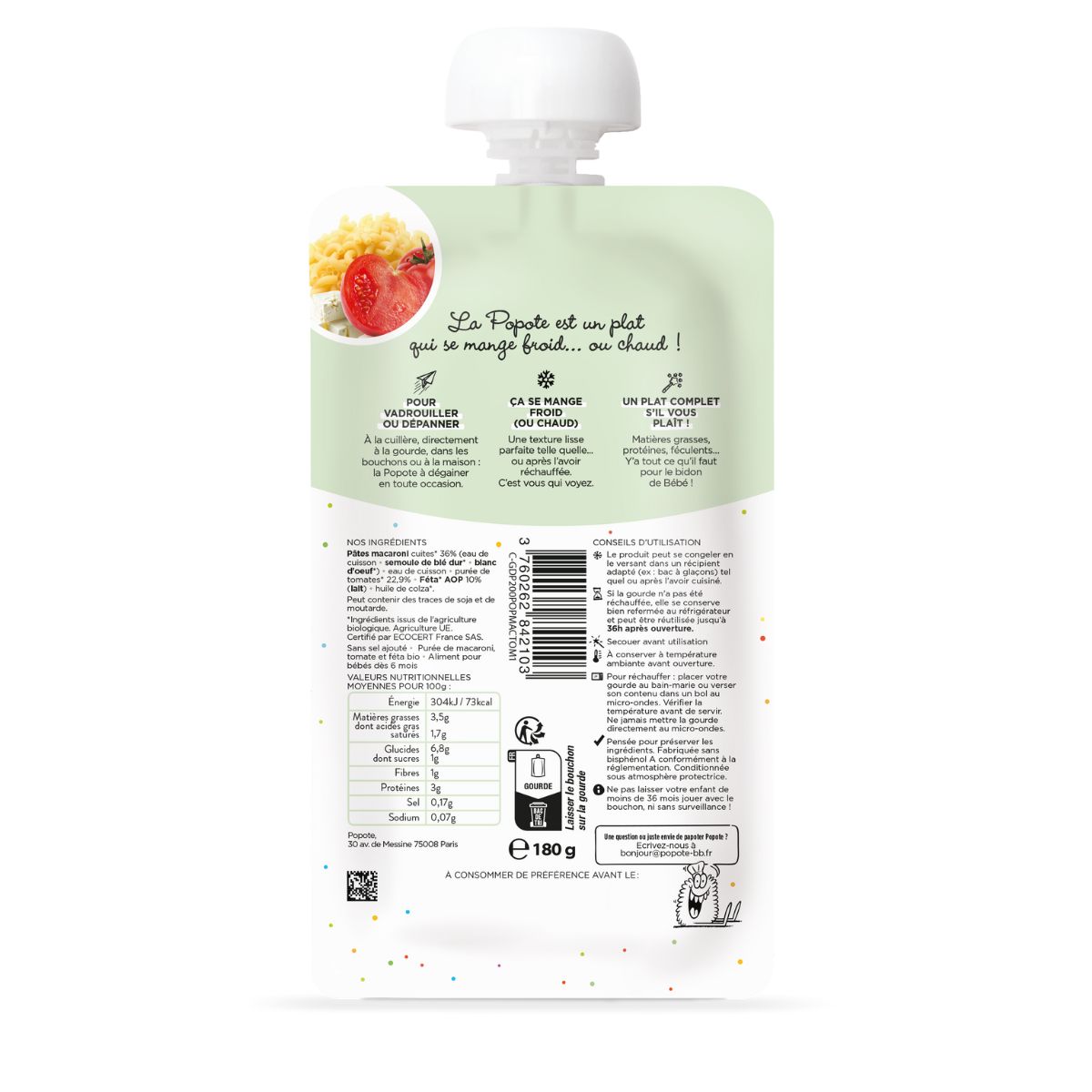 Paste macaroni fierte* 36% (apa de fierbere, GRIS DE GRAU DUR, ALBUS DE OU*), apa de fierbere, piure de rosii* 22.9%, FETA* AOP 10% (LAPTE), ulei de rapita*.