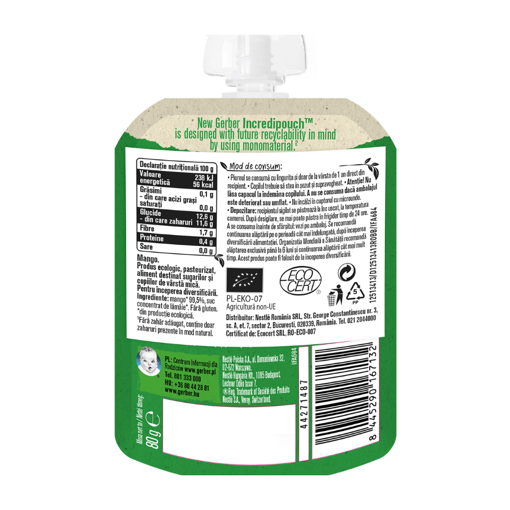 GERBER Piure Mango BIO are o textură delicată și este pasat fin, fiind potrivit pentru începerea diversificării alimentației bebelușului începând cu vârsta de 6 luni. Produsul aduce un nou gust natural și plăcut, fiind preparat din ingrediente de calitate, fără adaos de zahăr sau sare.
