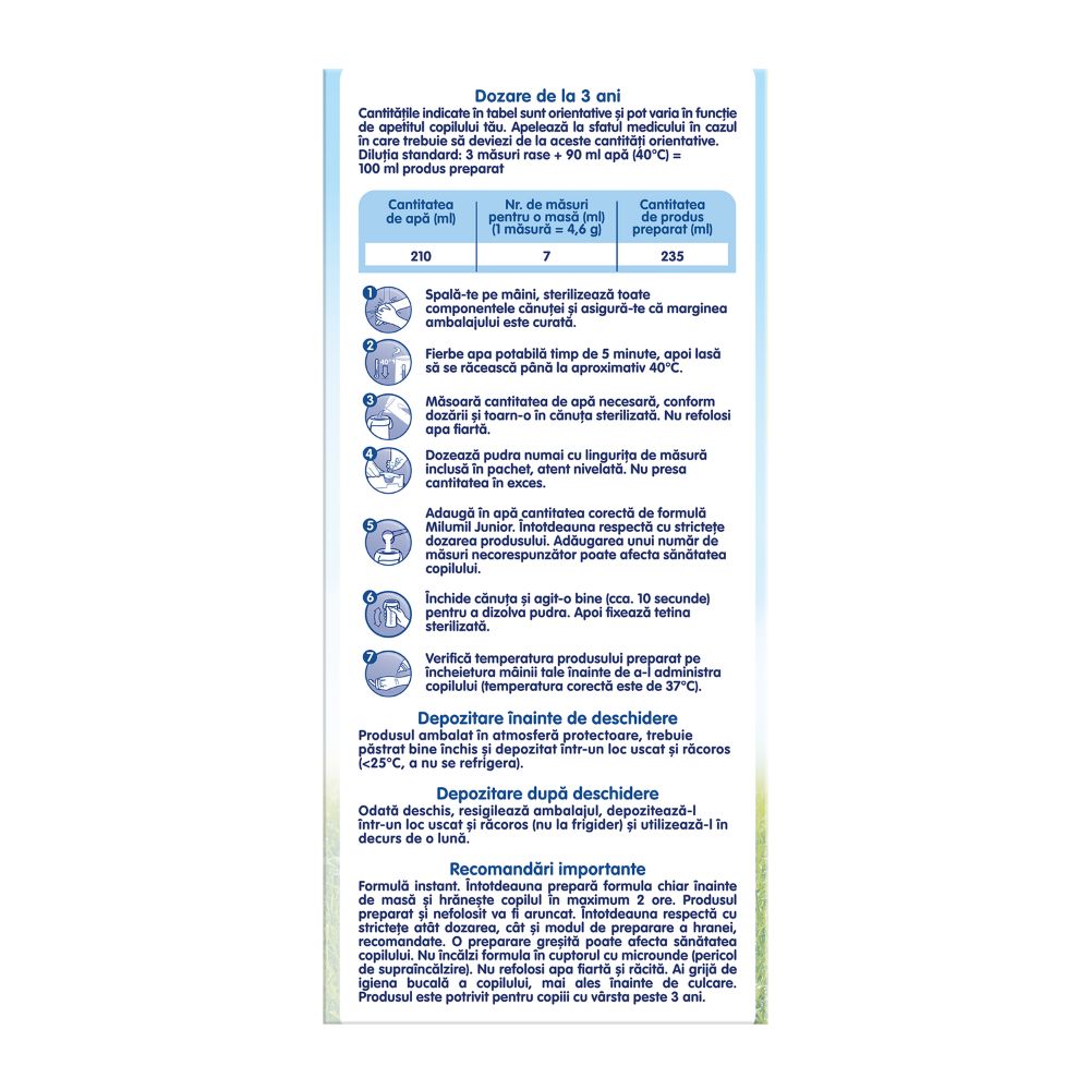 Pasul 5. Adaugă în apă cantitatea corectă de formulă Milumil Junior. Intotdeauna respectă cu stricteÅ£e dozarea produsului. Adăugarea unui numar de măsuri necorespunzator poate afecta sănătatea copilului.