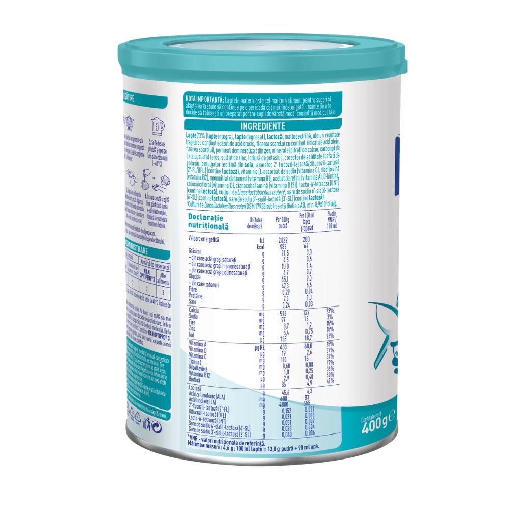 Lapte 73% (lapte integral, lapte degresat), lactoză, maltodextrină, uleiuri vegetale (rapiță cu conținut scăzut de acid erucic, floarea soarelui cu conținut ridicat de acid oleic, floarea soarelui), permeat demineralizat din zer, minerale (citrați de calciu, carbonat de calciu, sulfat feros, sulfat de zinc, iodură de potasiu), corector de aciditate fosfați de potasiu, emulgator lecitină din soia, amestec 2′-fucozil-lactoză/difucozil-lactoză (2′-FL/DFL) (conține lactoză), vitamine [L-ascorbat de sodiu (vitamina C), riboflavină (vitamina B2), mononitrat de tiamină (vitamina B1), acetat de retinil (vitamina A), D-biotină, colecalciferol (vitamina D), cianocobalamină (vitamina B12)], lacto-N-tetraoză (LNT) (conține lactoză), culturi de Limosilactobacillus reuteri*, sare de sodiu 6’-sialil-lactoză (6’-SL) (conține lactoză), sare de sodiu 3’-sialil-lactoză (3’-SL) (conține lactoză).
