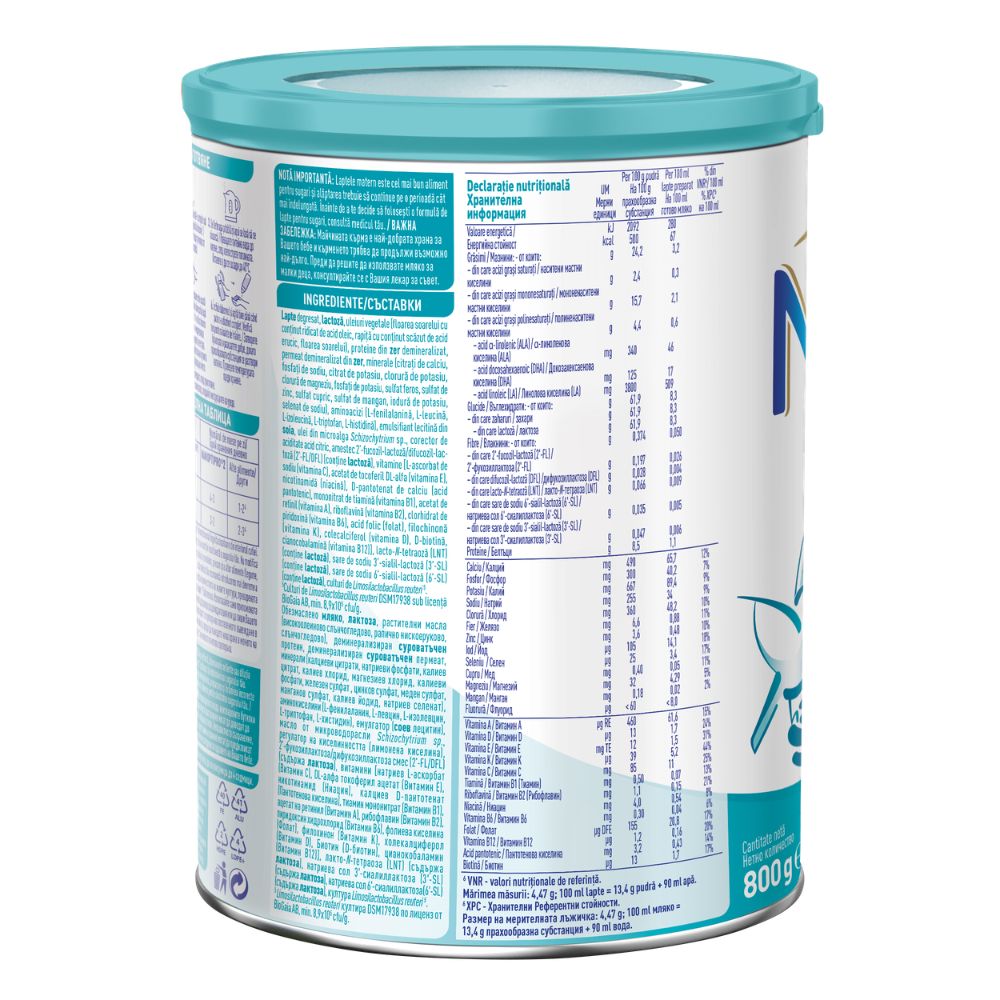 Lapte degresat, lactoză, uleiuri vegetale (floarea soarelui cu conținut ridicat de acid oleic, rapiță cu conținut scăzut de acid erucic, floarea soarelui), proteine din zer demineralizat, permeat demineralizat din zer, minerale (citrați de calciu, fosfați de sodiu, citrat de potasiu, clorură de potasiu, clorură de magneziu, fosfați de potasiu, sulfat feros, sulfat de zinc, sulfat cupric, sulfat de mangan, iodură de potasiu, selenat de sodiu), aminoacizi (L-fenilalanină, L-leciună, L-izoleucină, L-triptofan, L-histidină), emulsifiant lecitină din soia, ulei de microalga Schizochytrium sp., corector de aciditate acid citric, amestec 2'-fucozil-lactoză/difucozil-lactoză (2'-FL/DFL) (conține lactoză), vitamine [L-ascorbat de sodiu (vitamina C), acetat de tocoferil DL-alfa (vitamina E), nicotinamidă (niacină), D-pantotenat de calciu (acid pantotenic), mononitrat de tiamină (vitamina B1), acetat de retinil (vitamina A), riboflavină (vitamina B2), clorhidrat de piridoxină (vitamina B6), acid folic (folat), filochinonă (vitamina K), colecalciferol (vitamina D), D-biotină, cianocobalamină (vitamina B12)], lacto-N-tetraoză (LNT) (conține lactoză), sare de sodiu 3'sialil-lactoză (3'-SL) (conține lactoză), sare de sodiu 6'sialil-lactoză (6'-SL) (conține lactoză), culturi de Limosilactobacillus reuteri*. 5Culturi de Limosilactobacillus reuteri DSM17938 sub licență BioGaia AB, min. 8,9x10^5 cfu/g.