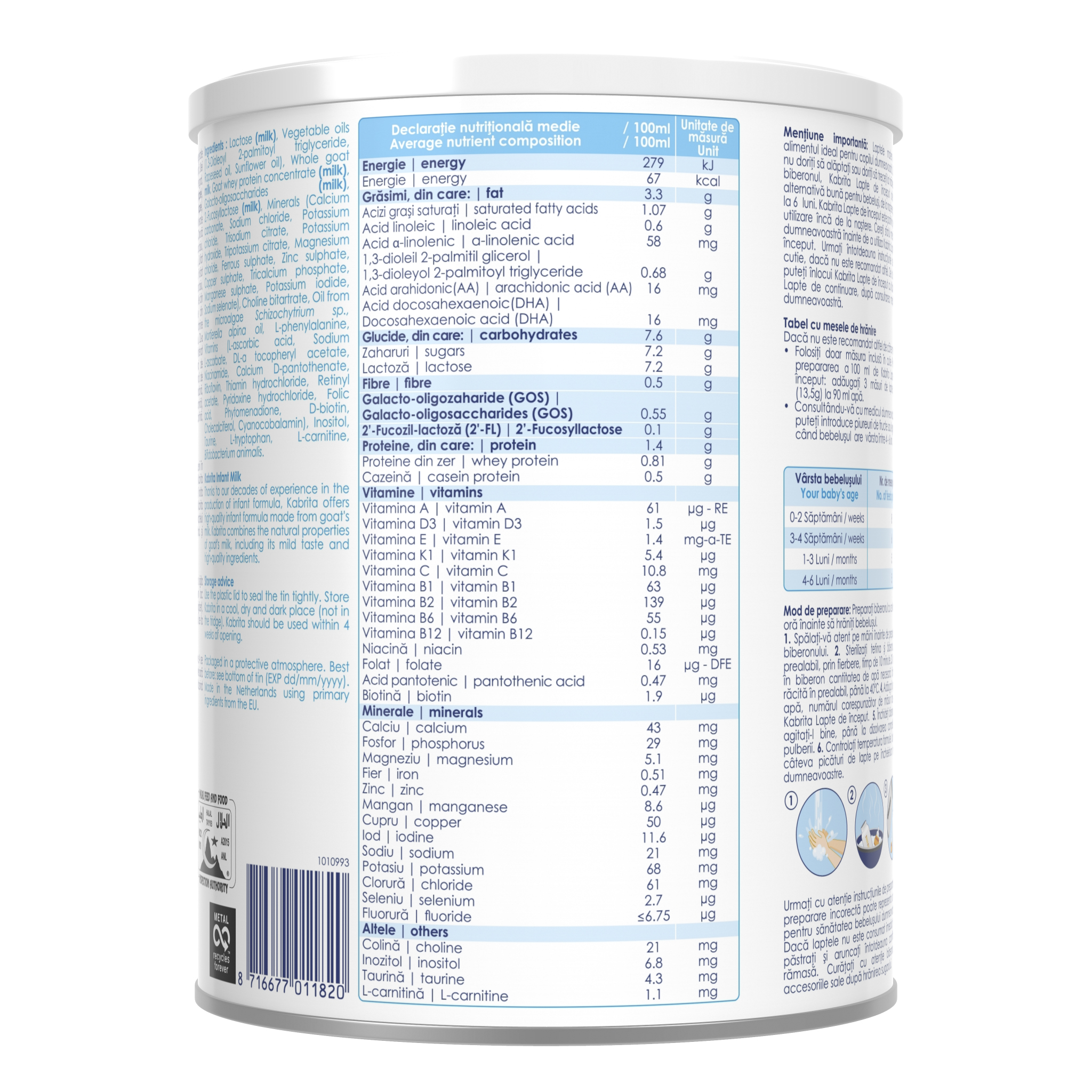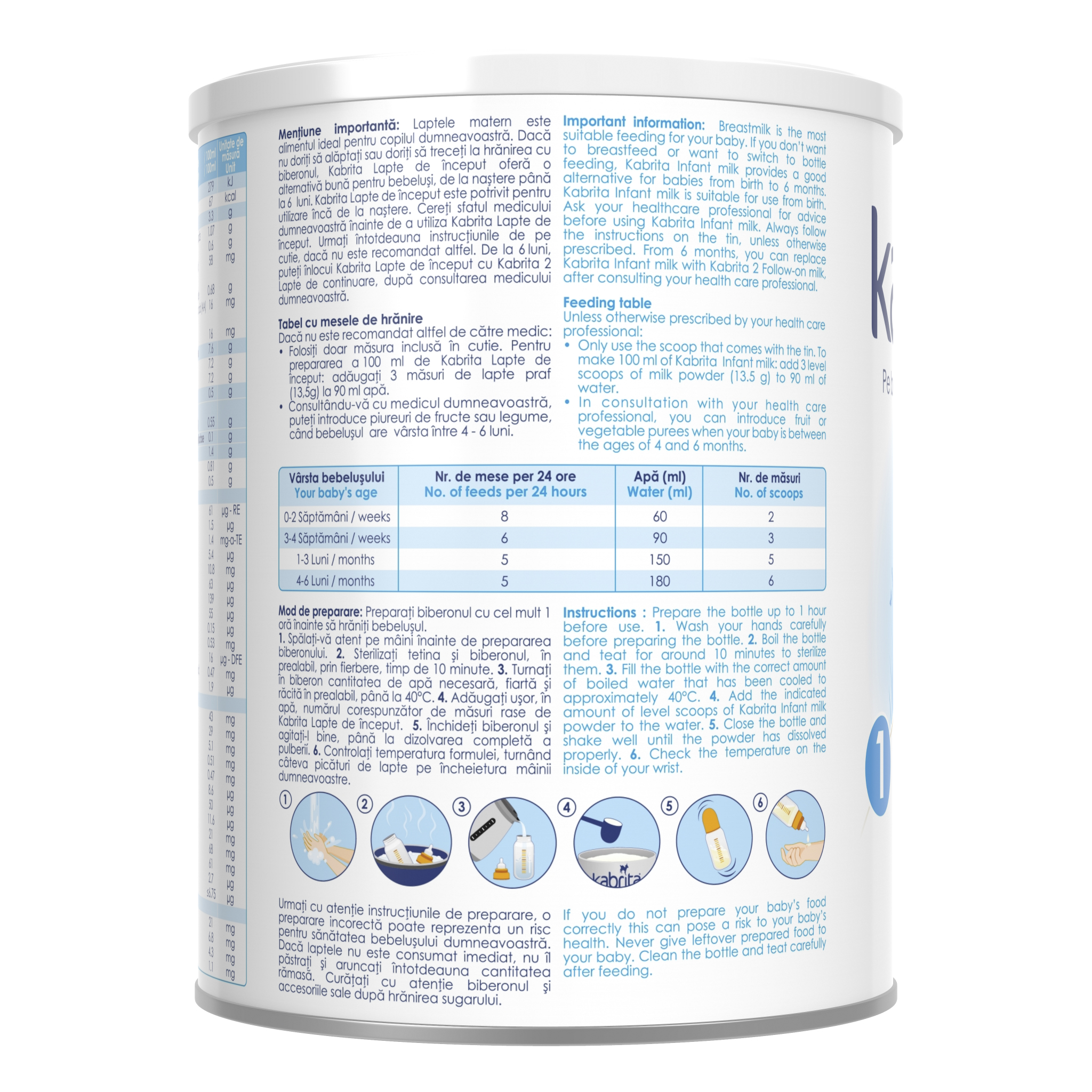 Urmați cu atenție instrucțiunile de preparare, o preparare incorectă poate reprezenta un risc pentru sănătatea bebelușului dumneavoastră. Dacă laptele nu este consumat imediat, nu îl păstrați şi aruncați întotdeauna cantitatea rămasă. Curățați cu atenție biberonul şi accesoriile sale după hrănirea sugarului. De la 6 luni, puteți înlocui Kabrita 1 Lapte de început cu Kabrita 2 Lapte de continuare, după consultarea medicului dumneavoastră.